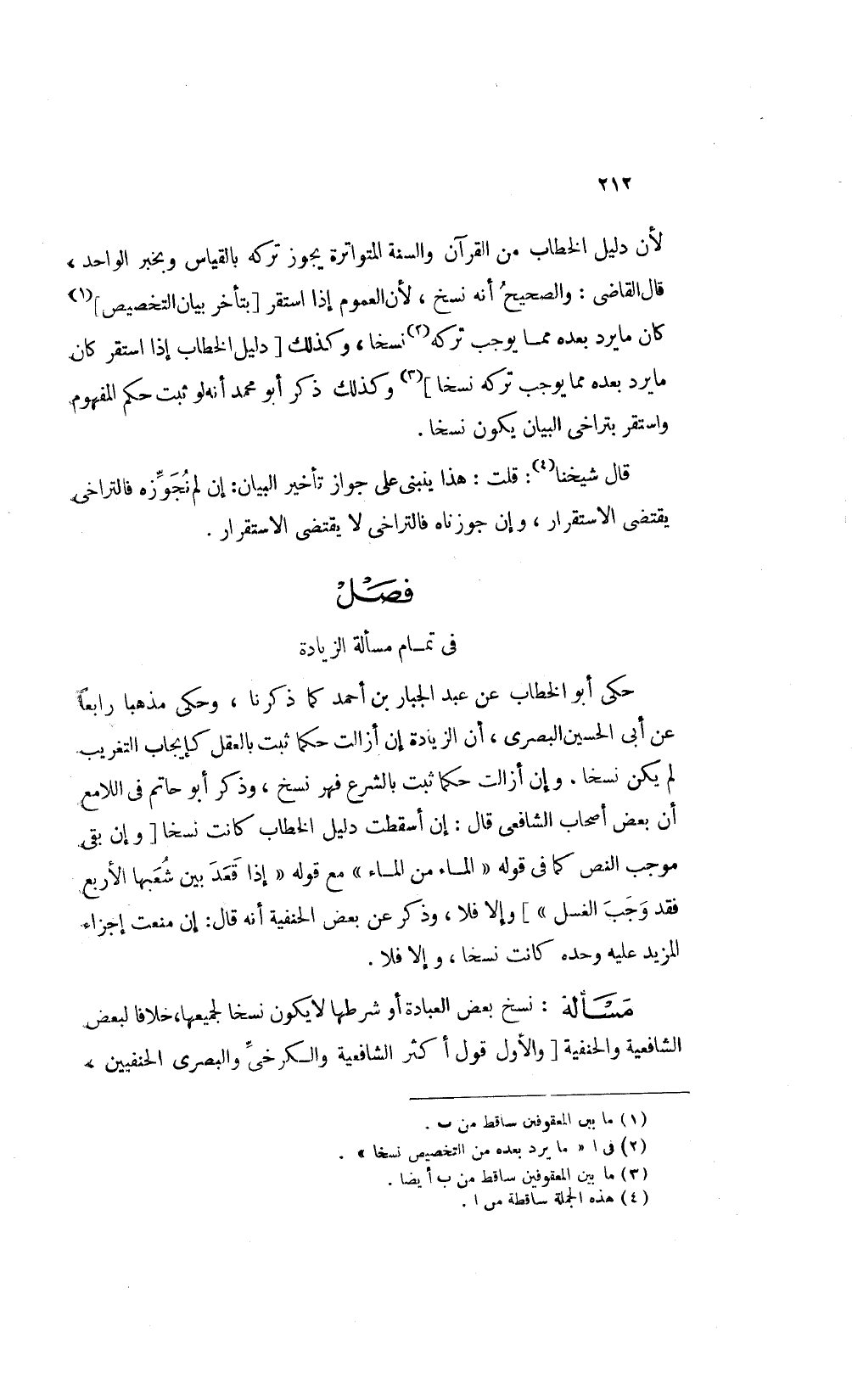 حكى أبو الخطاب عن عبد الجبار بن أحمد كما ذكرنا وحكى مذهبا رابعا عن أبي الحسين البصري أن الزيادة إن أزالت حكما ثبت بالعقل كإيجاب التغريب لم يكن نسخا وإن أزالت حكما ثبت بالشرع فهو نسخ وذكر أبو حاتم في اللامع أن بعض أصحاب الشافعي قال: إن أسقطت دليل الخطاب كانت نسخا وإن بقى موجب النص كما في قوله: "الماء من الماء" مع قوله: "إذا قعد بين شعبها الأربع فقد وجب الغسل" وإلا فلا وذكر عن بعض الحنفية أنه قال: إن منعت إجزاء المزيد عليه وحده كانت نسخا وإلا فلا.