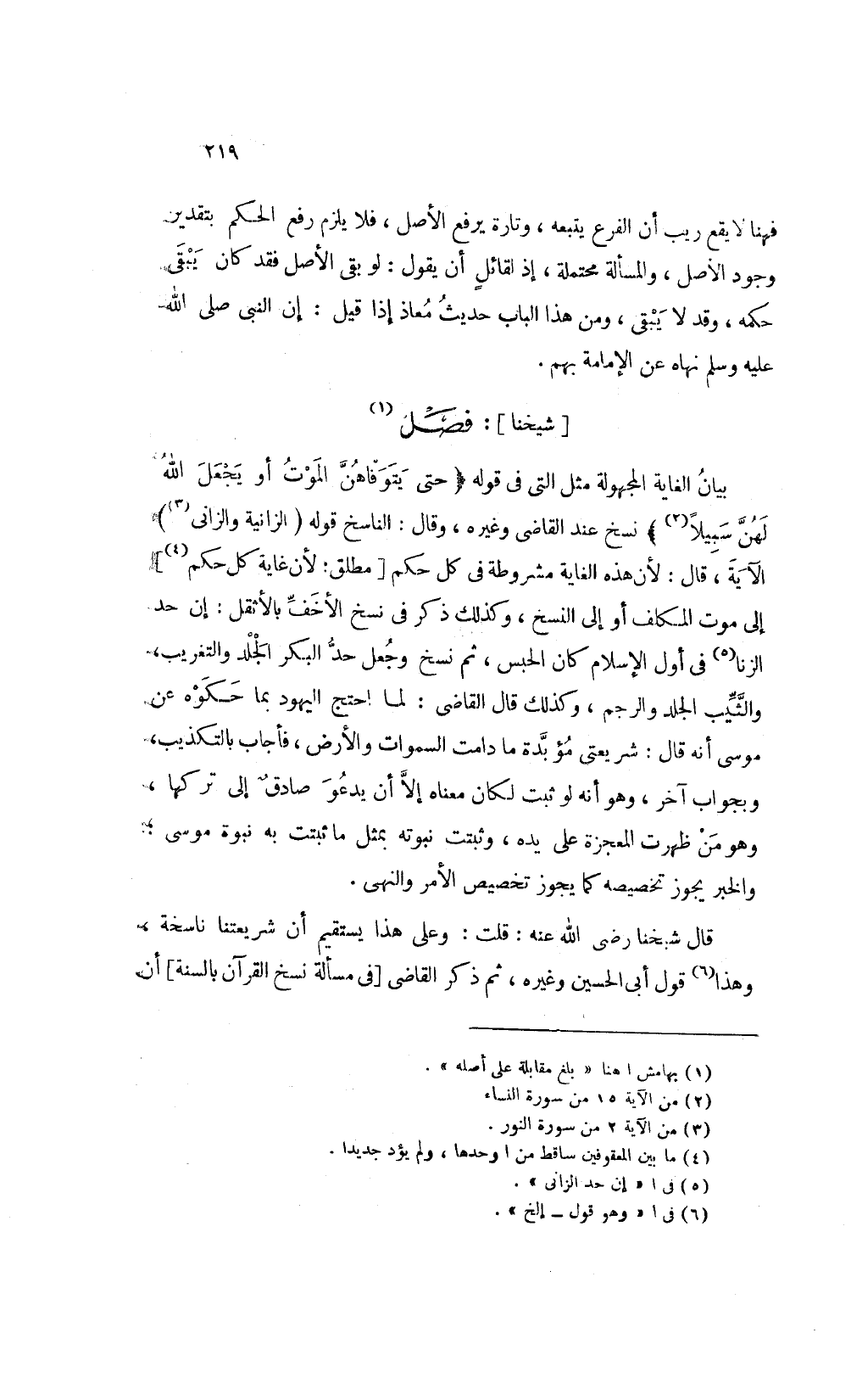 بيان الغاية المجهولة مثل التي في قوله: {حَتَّى يَتَوَفَّاهُنَّ الْمَوْتُ أَوْ يَجْعَلَ اللَّهُ لَهُنَّ سَبِيلاً} 2 نسخ عند القاضي وغيره وقال الناسخ قوله: {الزَّانِيَةُ وَالزَّانِي} 3 الآية قال: لأن هذه الغاية مشروطة في كل حكم [مطلق لأن غاية كل حكم] 4 إلى موت المكلف أو إلى النسخ وكذلك ذكر في نسخا الأخف بالأثقل إن حد الزنا5 في أول الإسلام كان الحبس ثم نسخ وجعل حد البكر الجلد والتغريب والثيب الجلد والرجم وكذلك قال القاضي: لما احتج اليهود بما حكوه عن موسى أنه قال: شريعتي مؤبدة ما دامت السموات والأرض فأجاب بالتكذيب وبجواب آخر وهو أنه لو ثبت لكان معناه إلا أن يدعو صادق إلى تركها وهو من ظهرت المعجزة على يده وثبتت نبوته بمثل ما ثبتت به نبوة موسى والخبر يجوز تخصيصه كما يجوز تخصيص الأمر والنهي.