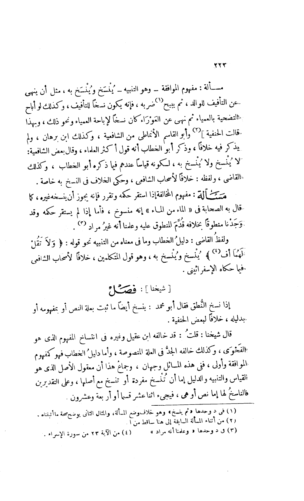 ولفظ القاضي دليل الخطاب وما في معناه من التنبيه نحو قوله: {فَلا تَقُلْ لَهُمَا أُفٍّ} 2 ينسخ وينسخ به وهو قول المتكلمين خلافا لأصحاب الشافعي فيما حكاه الاسفرائينى.