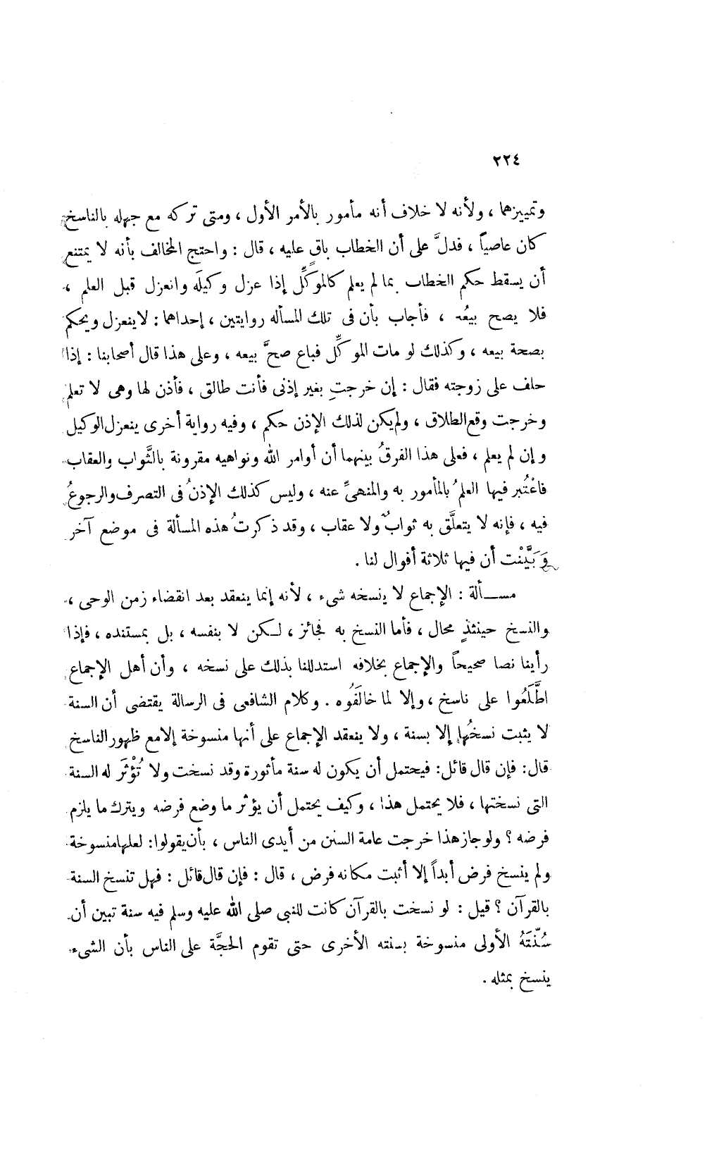 وتمييزهما ولأنه لا خلاف أنه مأمور بالأمر الأول ومتى تركه مع جهله بالناسخ كان عاصيا فدل على أن الخطاب باق عليه قال: واحتج المخالف بأنه لا يمتنع أن يسقط حكم الخطاب بما لم يعلم كالموكل إذا عزل وكيله وانعزل قبل العلم فلا يصح بيعه فأجاب بأن في تلك المسألة روايتين إحداهما لا ينعزل ويحكم بصحة بيعه وكذلك لو مات الموكل فباع صح بيعه وعلى هذا قال أصحابنا: إذا حلف على زوجته فقال إن خرجت بغير إذني فأنت طالق فأذن لها وهي لا تعلم وخرجت وقع الطلاق ولم يكن لذلك الإذن حكم وفيه رواية أخرى ينعزل الوكيل وإن لم يعلم فعلى هذا الفرق بينهما أن أوامر الله ونواهيه مقرونة بالثواب والعقاب فاعتبر فيها العلم بالمأمور به والمنهي عنه وليس كذلك الإذن في التصرف والرجوع فيه فإنه لا يتعلق به ثواب ولا عقاب وقد ذكرت هذه المسألة في موضع آخر وبينت أن فيها ثلاثة أقوال لنا.