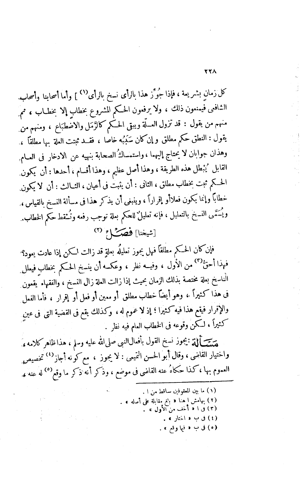 فان كان الحكم مطلقا فهل يجوز تعليله بعلة قد زالت لكن إذا عادت يعود فهذا أحق3 من الأول وفيه نظر وعكسه أن ينسخ الحكم بخطاب فيعلل الناسخ بعلة مختصة بذلك الزمان بحيث إذا زالت العلة زال النسخ والفقهاء يقعون في هذا كثيرا وهو أيضا خطاب مطلق أو معين أو فعل أو إقرار فأما الفعل والإقرار فيقع هذا فيه كثيرا إذ لا عموم له وكذلك يقع في القضية التي في عين كثيرا لكن وقوعه في الخطاب العام فيه نظر.