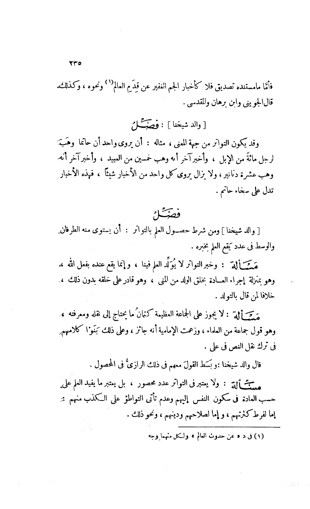 [والد شيخنا] ومن شرط حصول العلم بالتواتر أن يستوي منه الطرفان والوسط في عدد يقع العلم بخبره.