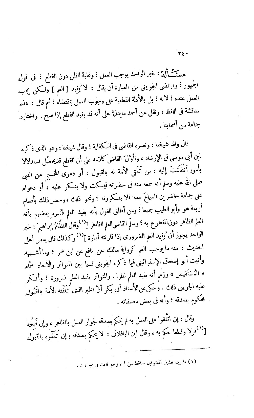 مسألة: خبر الواحد يوجب العمل وغلبة الظن دون القطع في قول الجمهور وارتضى الجويني من العبارة أن يقال لا يفيد [العلم] ولكن يجب العمل عنده لا به بل بالأدلة القطعية على وجوب العمل بمقتضاه ثم قال هذه مناقشة في اللفظ ونقل عن أحمد ما يدل على أنه يفيد القطع إذا صح واختاره جماعة من أصحابنا.
