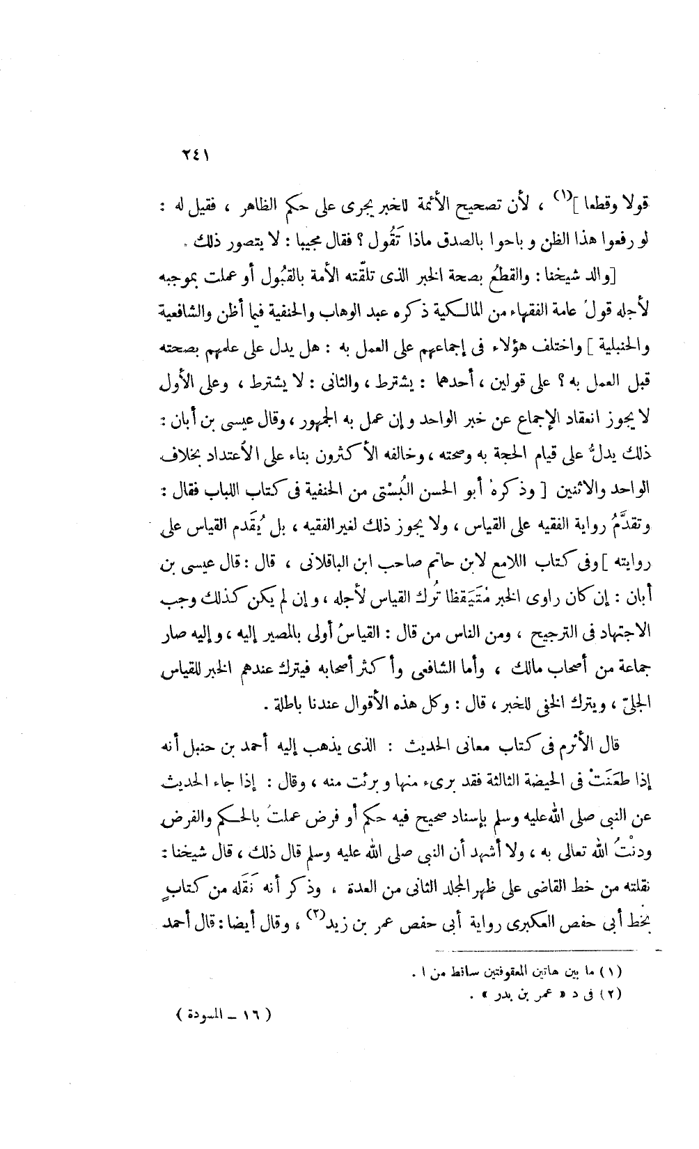 [والد شيخنا والقطع بصحة الخبر الذي تلقته الأمة بالقبول أو عملت بموجبه لأجله قول عامة الفقهاء من المالكية ذكره عبد الوهاب والحنفية فيما أظن والشافعية والحنبلية] واختلف هؤلاء في إجماعهم على العمل به هل يدل على علمهم بصحته قبل العمل به على قولين أحدهما يشترط والثاني لا يشترط وعلى الأول لا يجوز انعقاد الإجماع عن خبر الواحد وإن عمل به الجمهور وقال عيسى بن أبان ذلك يدل على قيام الحجة به وصحته وخالفه الأكثرون بناء على الاعتداد بخلاف الواحد والإثنين [وذكره أبو الحسن البستى من الحنفية في كتاب اللباب فقال وتقدم رواية الفقيه على القياس ولا يجوز ذلك لغير الفقيه بل يقدم القياس على روايته] وفى كتاب اللامع لابن حاتم صاحب ابن الباقلاني قال عيسى ابن أبان ان كان راوي الخبر متيقظا ترك القياس لأجله وإن لم يكن كذلك وجب الاجتهاد في الترجيح ومن الناس من قال القياس أولى بالمصير إليه واليه صار جماعة من أصحاب مالك وأما الشافعي وأكثر أصحابه فيترك عندهم الخبر للقياس الجلي ويترك الخفي للخبر قال وكل هذه الأقوال عندنا باطلة.