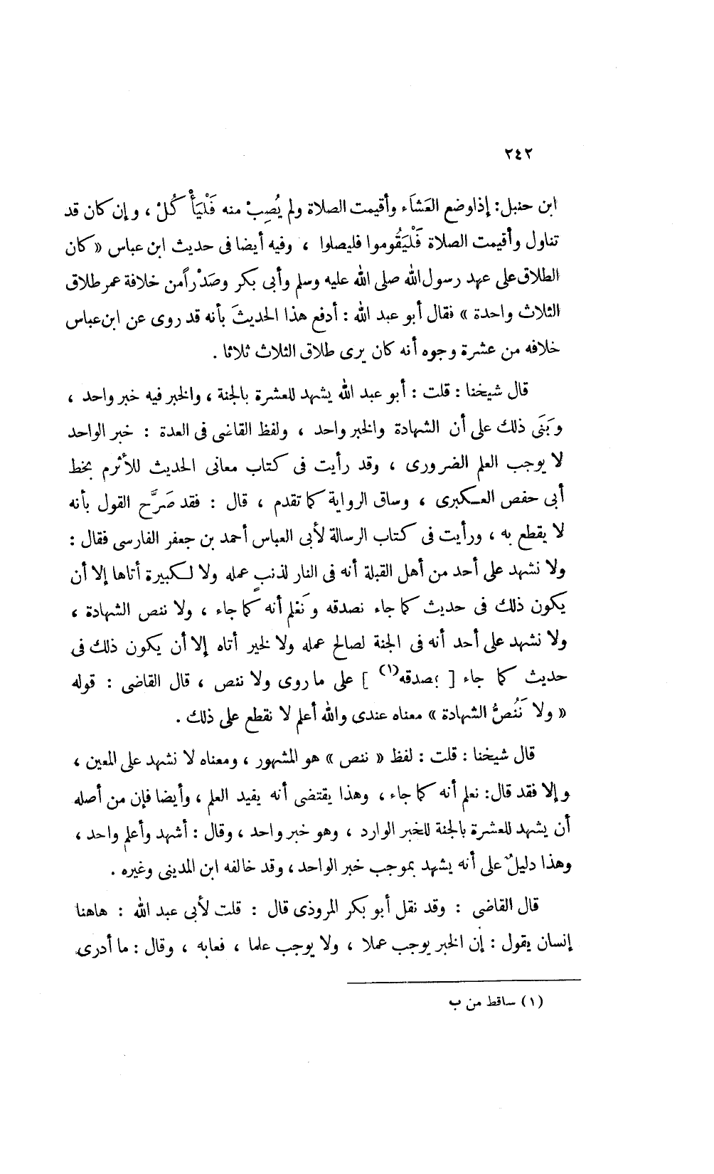 قال شيخنا قلت: أبو عبد الله يشهد للعشرة بالجنة والخبر خبر واحد وبنى ذلك على أن الشهادة والخبر واحد ولفظ القاضي في العدة خبر الواحد لا يوجب العلم الضروري وقد رأيت في كتاب معاني الحديث للأثرم بخط أبي حفص العكبري وساق الرواية كما تقدم قال فقد صرح القول بأنه لا يقطع به ورأيت في كتاب الرسالة لابى العباس أحمد بن جعفر الفارسي فقال ولا نشهد على أحد من أهل القبلة أنه في النار لذنب عمله ولا لكبيرة أتاها إلا أن يكون ذلك في حديث كما جاء نصدقه ونعلم أنه كما جاء ولا ننص الشهادة ولا نشهد على أحد أنه في الجنة لصالح عمله ولا لخير أتاه إلا أن يكون ذلك في حديث كما جاء [بصدقه] 1 على ما روى ولا ننص قال القاضي قوله ولا ننص الشهادة معناه عندى والله أعلم لا نقطع على ذلك.