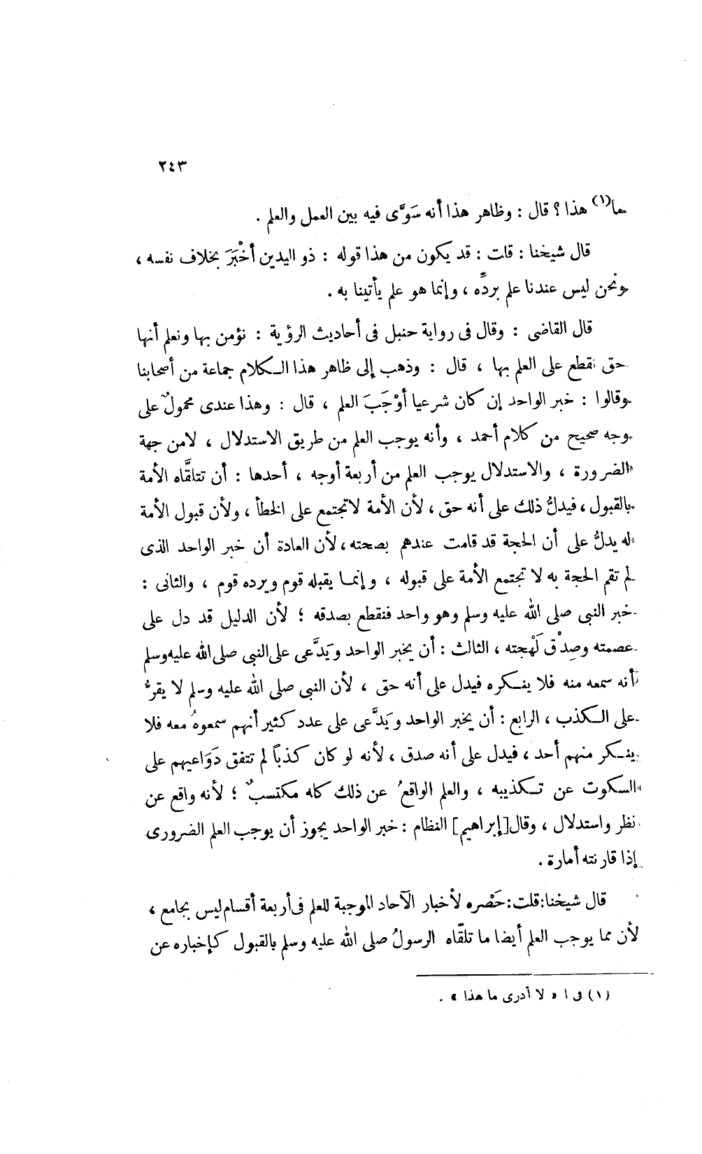 قال القاضي وقال في رواية حنبل في أحاديث الرؤية نؤمن بها ونعلم أنها حق نقطع على العلم بها قال وذهب إلى ظاهر هذا الكلام جماعة من أصحابنا وقالوا خبر الواحد ان كان شرعيا أوجب العلم قال وهذا عندى محمول على وجه صحيح من كلام أحمد وأنه يوجب العلم من طريق الاستدلال لا من جهة الضرورة والاستدلال يوجب العلم من أربعة أوجه أحدها أن تتلقاه الأمة بالقبول فيدل ذلك على أنه حق لأن الأمة لا تجتمع على الخطأ ولان قبول الأمة له يدل على أن الحجة قد قامت عندهم بصحته لأن العادة أن خبر الواحد الذي لم تقم الحجة به لا تجتمع الأمة على قبوله وإنما يقبله قوم ويرده قوم والثاني خبر النبي صلى الله عليه وسلم وهو واحد فنقطع بصدقه لأن الدليل قد دل على عصمته وصدق لهجته الثالث أن يخبر الواحد ويدعى على النبي صلى الله عليه وسلم أنه سمعه منه فلا ينكره فيدل على أنه حق لأن النبي صلى الله عليه وسلم لا يقر على الكذب الرابع أن يخبر الواحد ويدعى على عدد كثير أنهم سمعوه معه فلا ينكر منهم أحد فيدل على أنه صدق لأنه لو كان كذبا لم تتفق دواعيهم على السكوت عن تكذيبه والعلم الواقع عن ذلك كله مكتسب لأنه واقع عن نظر واستدلال وقال إبراهيم النظام خبر الواحد يجوز أن يوجب العلم الضرورى إذا قارنته أمارة.
