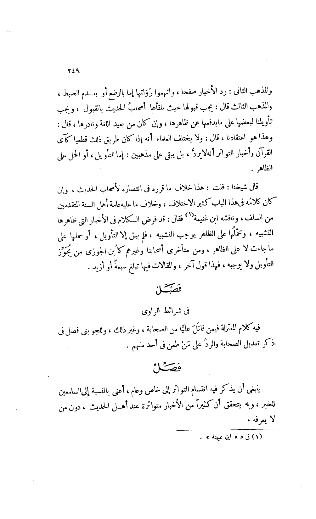 والمذهب الثاني رد الأخبار صفحا واتهموا رواتها اما بالوضع أو بعدم الضبط والمذهب الثالث قال يجب قبولها حيث تلقاها أصحاب الحديث بالقبول ويجب تأويلنا لبعضها على ما يدفعها عن ظاهرها وإن كان من بعيد اللغة ونادرها قال وهذا هو اعتقادنا قال ولا يختلف العلماء أنه إذا كان طريق ذلك قطعيا كآى القرآن وأخبار التواتر أنه لا يرد بل يبقى على مذهبين اما التأويل أو الحمل على الظاهر.