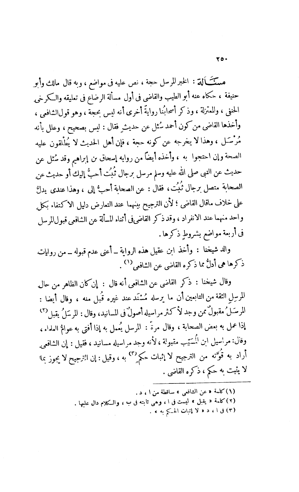 وقال شيخنا ذكر القاضي عن الشافعي أنه قال ان كان الظاهر من حال المرسل الثقة من التابعين أن ما يرسله مسند عند غيره قبل منه وقال أيضا المرسل مقبول ممن وجد لاكثر مراسيله أصول في المسانيد وقال المرسل يقبل2 إذا عمل به بعض الصحابة وقال مرة المرسل يعمل به إذا أفتى به عوام العلماء وقال مراسيل ابن المسيب مقبولة لأنه وجد مراسيله مسانيد فقيل ان الشافعي أراد به قوته من الترجيح لا اثبات حكم3 به وقيل ان الترجيح لا يجوز بما لا يثبت به حكم ذكره القاضي.