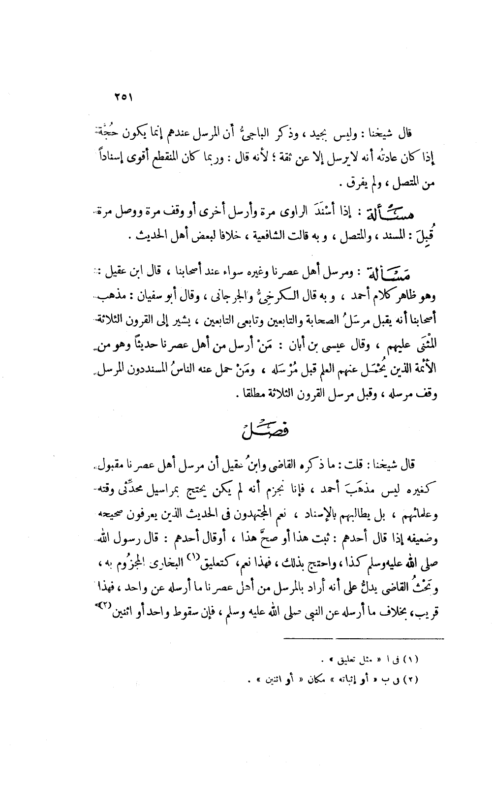 قال شيخنا قلت: ما ذكره القاضي وابن عقيل أن مرسل أهل عصرنا مقبول كغيره ليس مذهب أحمد فانا نجزم أنه لم يكن يحتج بمراسيل محدثى وقته وعلمائهم بل يطالبهم بالاسناد نعم المجتهدون في الحديث الذين يعرفون صحيحه وضعيفه إذا قال أحدهم ثبت هذا أو صح هذا أو قال أحدهم قال رسول الله صلى الله عليه وسلم كذا واحتج بذلك فهذا نعم كتعليق1 البخاري المجزوم به وبحث القاضي يدل على أنه أراد بالمرسل من أهل عصرنا ما أرسله عن واحد فهذا قريب بخلاف ما أرسله عن النبي صلى الله عليه وسلم فإن سقوط واحد أو اثنين2