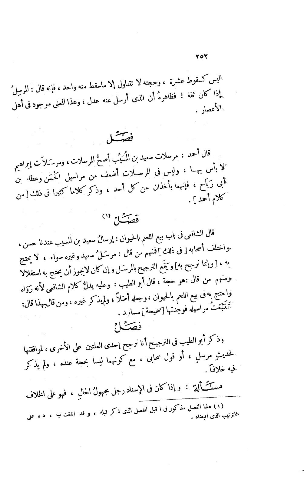 قال الشافعي في باب بيع اللحم بالحيوان ارسال سعيد بن المسيب عندنا حسن واختلف أصحابه [في ذلك] فمنهم من قال مرسل سعيد وغيره سواء لا يحتج به [وإنما نرجح به] ويقع الترجيح بالمرسل وإن كان لا يجوز أن يحتج به استقلالا ومنهم من قال هو حجة قال أبو الطيب وعليه يدل كلام الشافعي لأنه رواه واحتج به في بيع اللحم بالحيوان وجعله أصلا ولم يذكر غيره ومن قال بهذا قال تتبعت مراسيله فوجدتها [صحيحة] مسانيد.