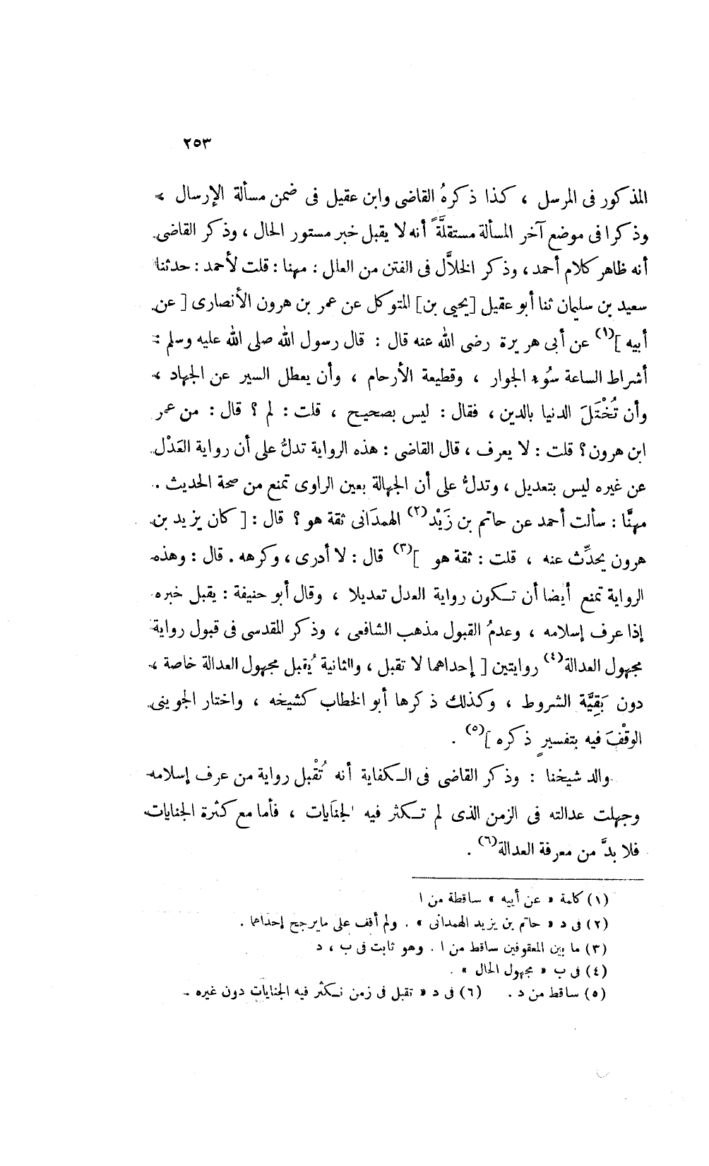 المذكور في المرسل كذا ذكره القاضي وابن عقيل في ضمن مسألة الارسال وذكرا في موضع آخر المسألة مستقلة أنه لا يقبل خبر مستور الحال وذكر القاضي أنه ظاهر كلام أحمد وذكر الخلال في الفتن من العلل مهنا قلت: لاحمد حدثنا سعيد بن سليمان ثنا أبوعقيل يحيى بن المتوكل عن عمربن هارون الأنصاري [عن أبيه] 1 عن أبي هريرة رضى الله عنه قال قال رسول الله صلى الله عليه وسلم: "أشراط الساعة سوء الجوار وقطيعة الأرحام وإن يعطل السير عن الجهاد وإن تختل الدنيا بالدين" فقال ليس بصحيح قلت: لم قال من عمر ابن هارون قلت: لا يعرف قال القاضي هذا الرواية تدل على أن رواية العدل عن غيره ليس بتعديل وتدل على أن الجهالة بعين الراوى تمنع من صحة الحديث مهنا سألت أحمد عن حاتم بن زيد2 الهمذاني ثقة هو قال [كان يزيد بن هارون يحدث عنه قلت: ثقة هو] 3 قال لا أدري وكرهه قال وهذه الرواية تمنع أيضا أن تكون رواية العدل تعديلا وقال أبو حنيفة يقبل خبره إذا عرف اسلامه وعدم القبول مذهب الشافعي وذكر المقدسي في قبول رواية مجهول العدالة4 روايتين [إحداهما لا تقبل والثانية يقبل مجهول العدالة خاصة دون بقية الشروط وكذلك ذكرها أبوالخطاب كشيخه واختار الجوينى الوقف فيه بتفسير ذكره] 5.