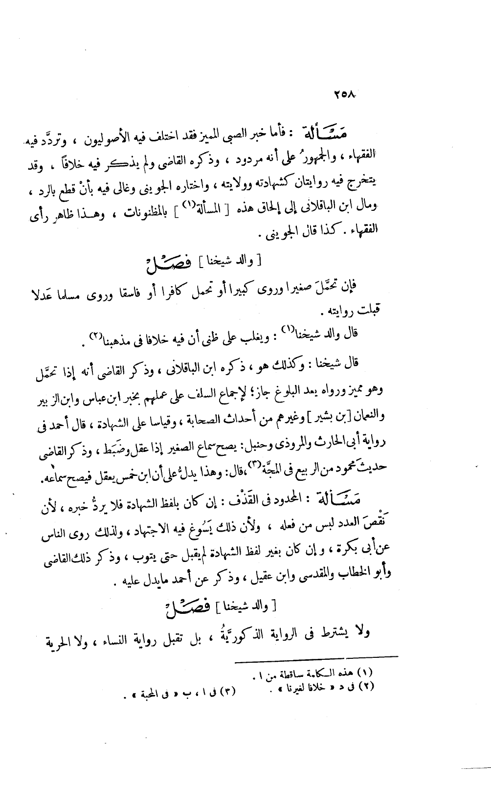 قال شيخنا وكذلك هو ذكره ابن الباقلاني وذكر القاضي أنه إذا تحمل وهو مميز ورواه بعد البلوغ جاز لاجماع السلف على عملهم بخبر ابن عباس وابن الزبير والنعمان بن بشير وغيرهم من أحداث الصحابة وقياسا على الشهادة قال أحمد في رواية أبي الحارث والمروذي وحنبل يصح سماع الصغير إذا عقل وضبط وذكر القاضي حديث محمود بن الربيع في المجة3 قال وهذا يدل على أن ابن خمس يعقل فيصح سماعه.