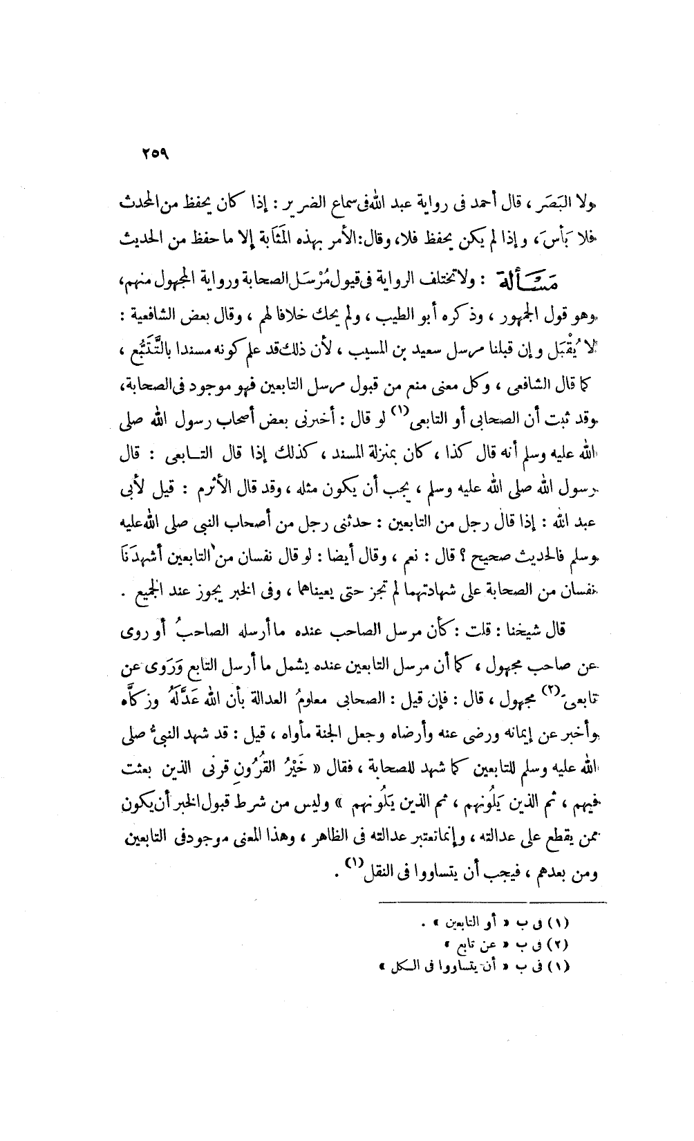 قال شيخنا قلت: كأن مرسل الصاحب عنده ما أرسله الصاحب أو روى عن صاحب مجهول كما أن مرسل التابعين عنده يشمل ما أرسل التابع وروى عن تابعي2 مجهول قال فإن قيل الصحابي معلوم العدالة بأن الله عدله وزكاه وأخبر عن ايمانه ورضى عنه وأرضاه وجعل الجنة مأواه قيل قد شهد النبي صلى الله عليه وسلم للتابعين كما شهد للصحابة فقال: "خير القرون قرني الذين بعثت فيهم ثم الذين يلونهم ثم الذين يلونهم" وليس من شرط قبول الخبر أن يكون ممن يقطع على عدالته وإنما نعتبر عدالته في في الظاهر وهذا المعنى موجود في التابعين ومن بعدهم فيجب أن يتساووا في النقل3.