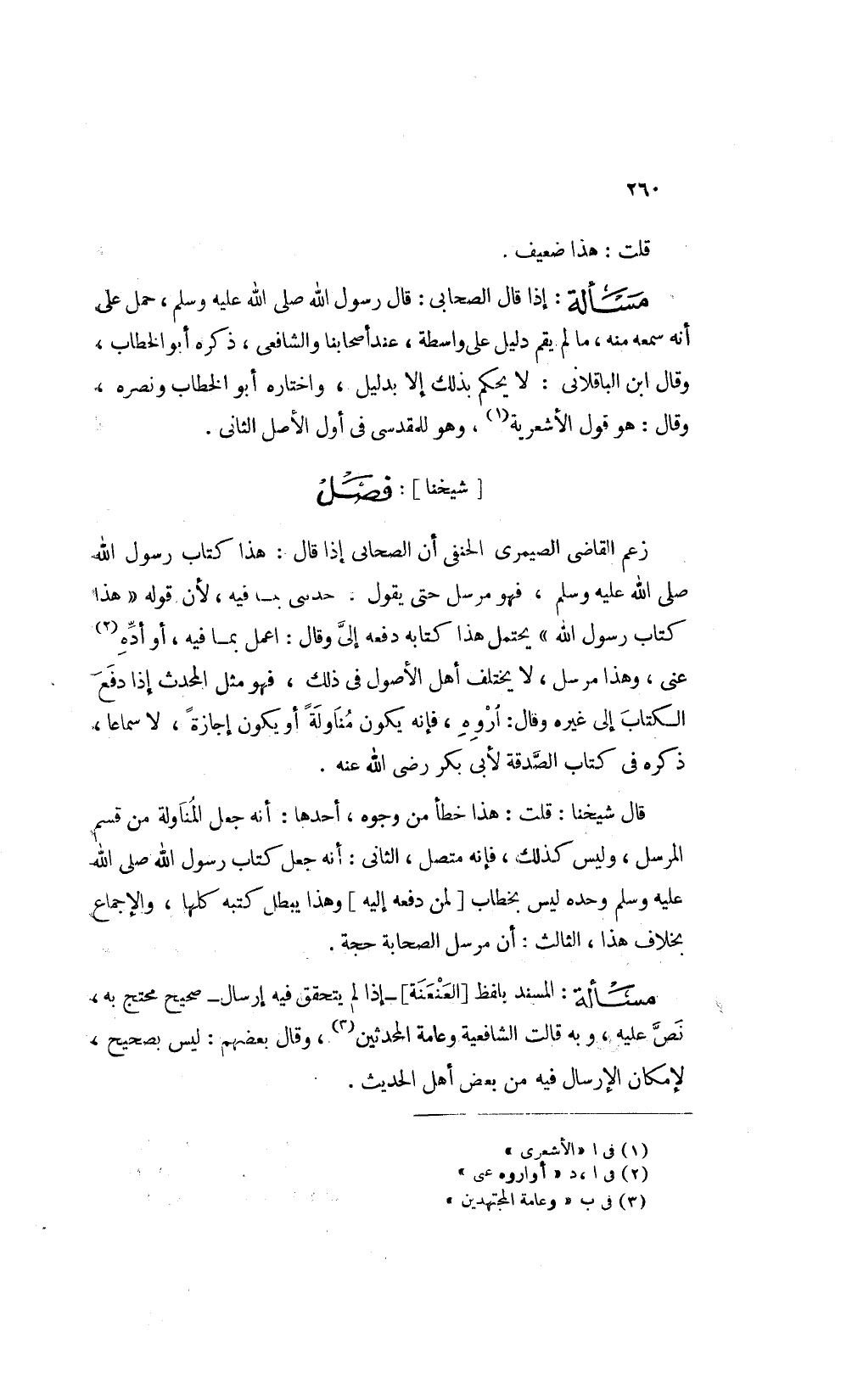 قال شيخنا قلت: هذا خطأ من وجوه أحدها أنه جعل المناولة من قسم المرسل وليس كذلك فانه متصل الثاني أنه جعل كتاب رسول الله صلى الله عليه وسلم وحده ليس بخطاب [لمن دفعه إليه] وهذا يبطل كتبه كلها والاجماع بخلاف هذا الثالث أن مرسل الصحابة حجة.