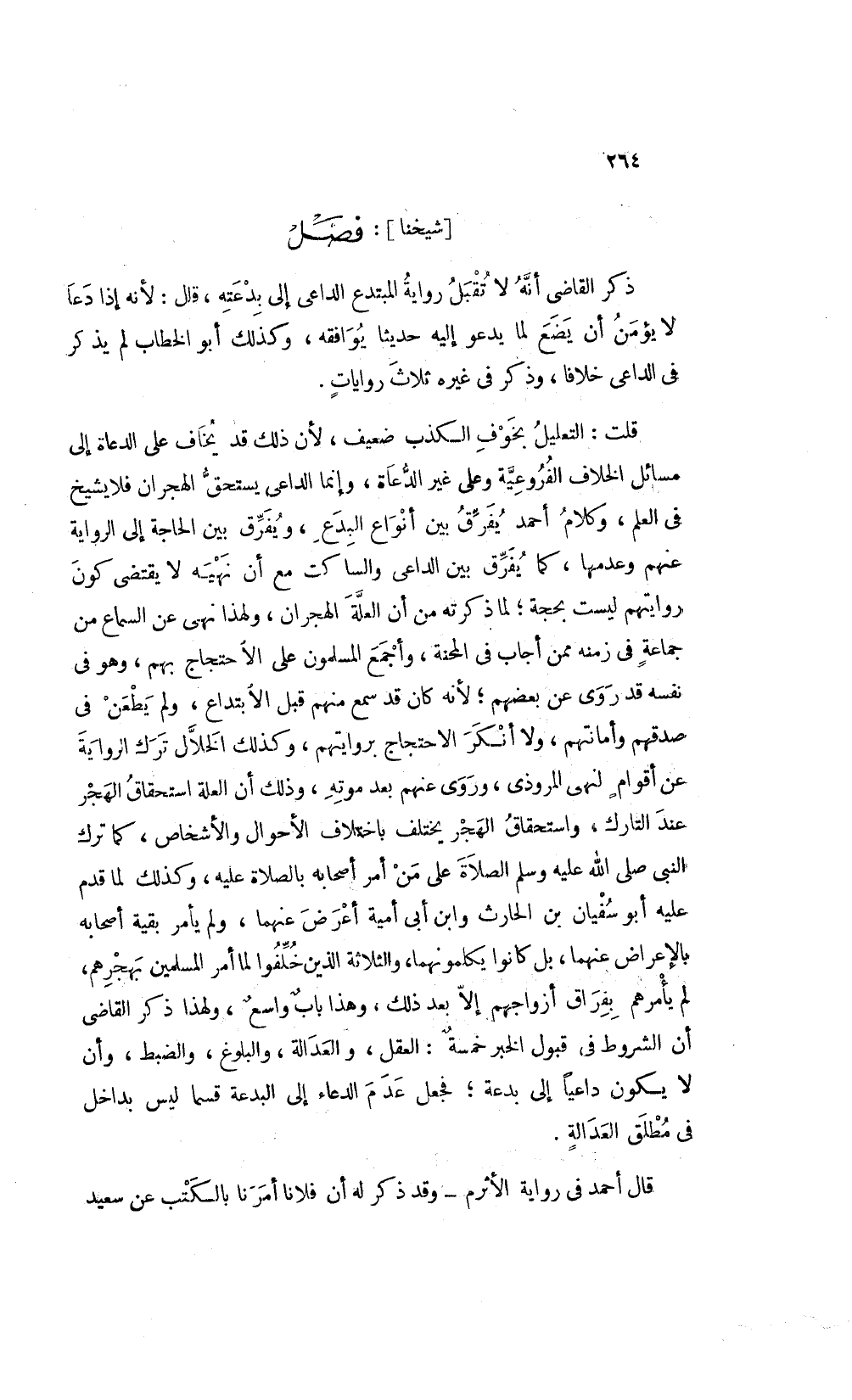 قلت التعليل بخوف الكذب ضعيف لأن ذلك قد يخاف على الدعاة إلى مسائل الخلاف الفروعية وعلى غير الدعاة وإنما الداعي يستحق الهجران فلا يشيخ في العلم وكلام أحمد يفرق بين أنواع البدع ويفرق بين الحاجة إلى الرواية عنهم وعدمها كما يفرق بين الداعى والساكت مع أن نهيه لا يقتضى كون روايتهم ليست بحجة لما ذكرته من أن العلة الهجران ولهذا نهى عن السماع من جماعة في زمنه ممن أجاب في المحنة وأجمع المسلمون على الاحتجاج بهم وهو في نفسه قد روى عن بعضهم لأنه كان قد سمع منهم قبل الابتداع ولم يطعن في صدقهم وأمانتهم ولا أنكر الاحتجاج بروايتهم وكذلك الخلال ترك الرواية عن أقوام لنهى المروذى وروى عنهم بعد موته وذلك أن العلة استحقاق الهجر عند التارك واستحقاق الهجر يختلف باختلاف الاحوال والاشخاص كما ترك النبي صلى الله عليه وسلم على من أمر أصحابه بالصلاة عليه وكذلك لما قدم عليه أبو سفيان بن الحارث وابن أبي أمية أعرض عنهما ولم يأمر بقية أصحابه بالاعراض عنهما بل كانوا يكلمونهما والثلاثة الذين خلفوا لما أمر المسلمين بهجرهم لم يأمرهم بفراق أزواجهم إلا بعد ذلك وهذا باب واسع ولهذا ذكر القاضي أن الشروط في قبول الخبر خمسة العقل والعدالة والبلوغ والضبط وإن لا يكون داعيا إلى بدعة فجعل الدعاء إلى البدعة قسما ليس بداخل في مطلق العدالة.