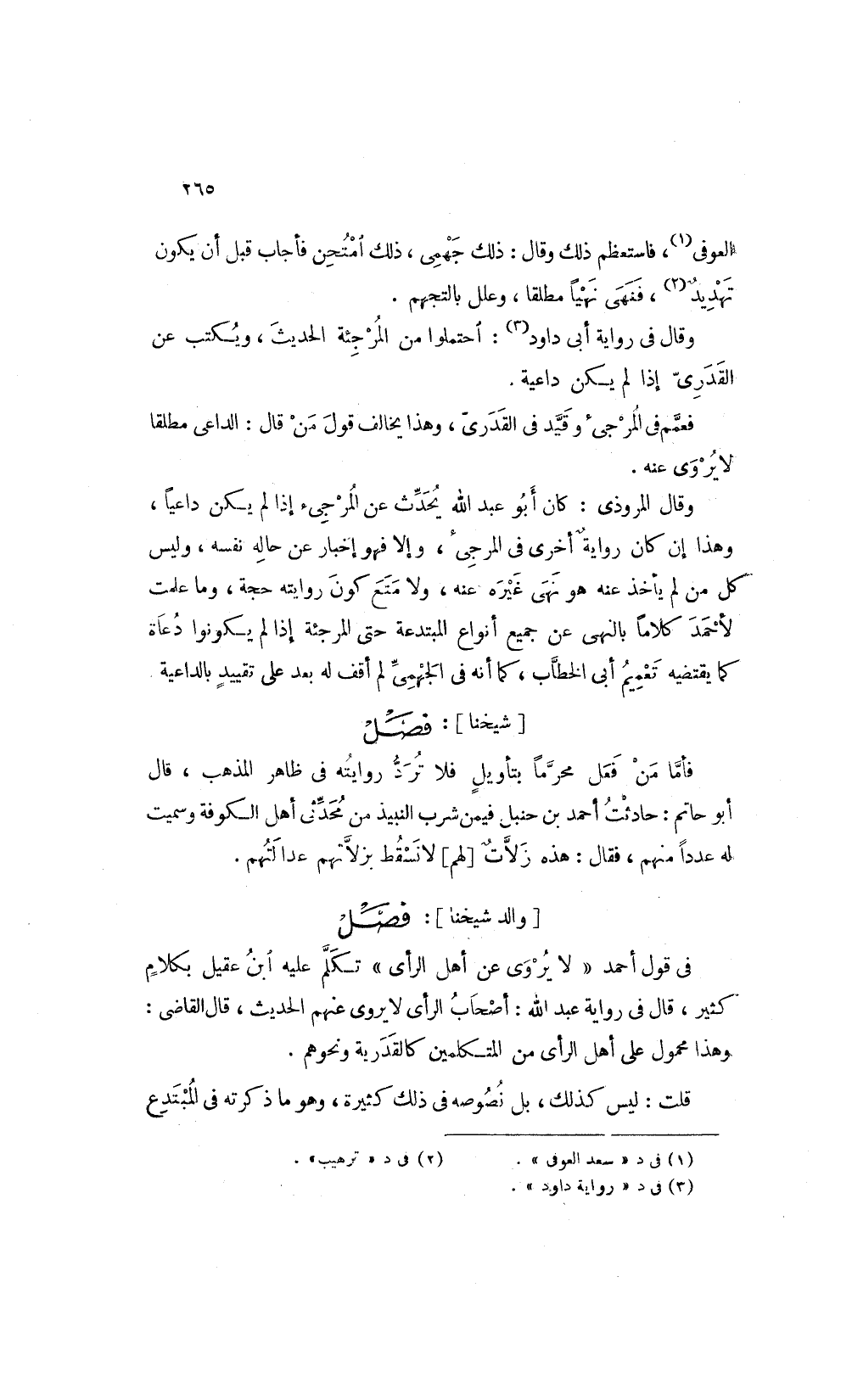 فى قول أحمد: "لا يروى عن أهل الرأى" تكلم عليه ابن عقيل بكلام كثير قال في رواية عبد الله أصحاب الرأى لا يروى عنهم الحديث قال القاضي وهذا محمول على أهل الرأى من المتكلمين كالقدرية ونحوهم.
