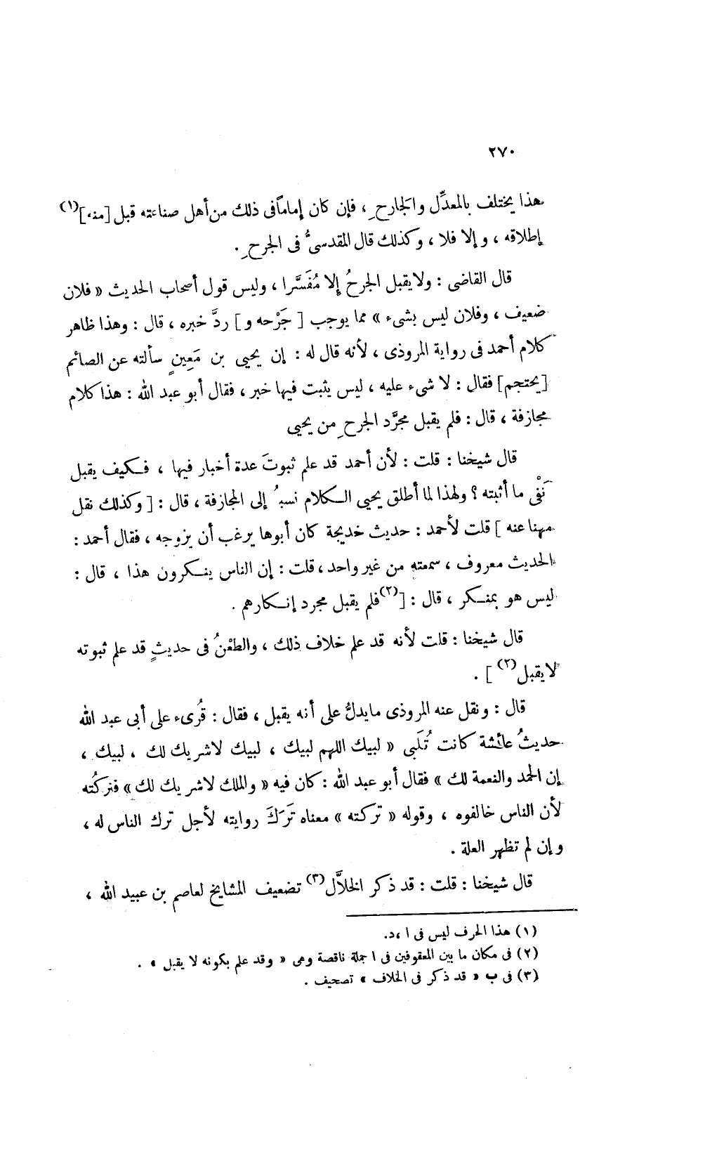 قال القاضي ولا يقبل الجرح إلا مفسرا وليس في قول أصحاب الحديث [فلان ضعيف] وفلان ليس بشىء مما يوجب [جرحه و] رد خبره قال وهذا ظاهر كلام أحمد في رواية المروذى لأنه قال له إن يحيى بن معين سألته عن الصائم [يحتجم] فقال لا شىء عليه ليس يثبت فيها خبر فقال أبو عبد الله هذا كلام مجازفة قال فلم يقبل مجرد الجرح من يحيى.