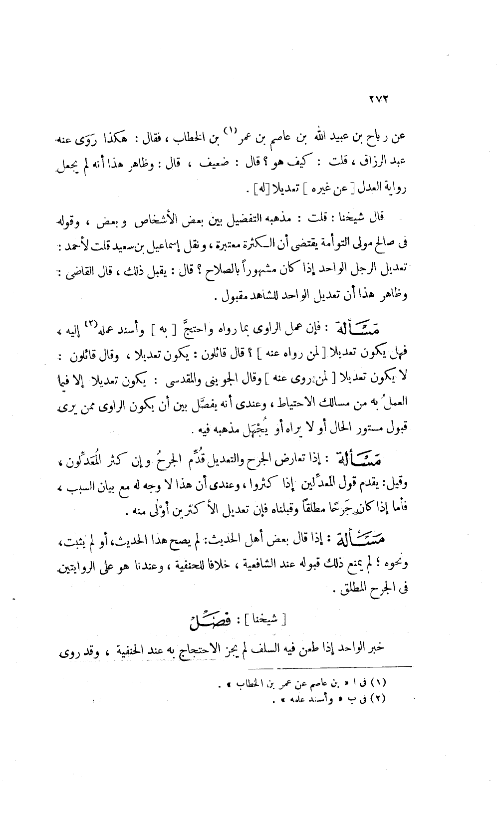 مسألة: إذا قال بعض أهل الحديث لم يصح هذا الحديث أو لم يثبت ونحوه لم يمنع ذلك قبوله عند الشافعية خلافا للحنفية وعندنا هو على الروايتين في الجرح المطلق.