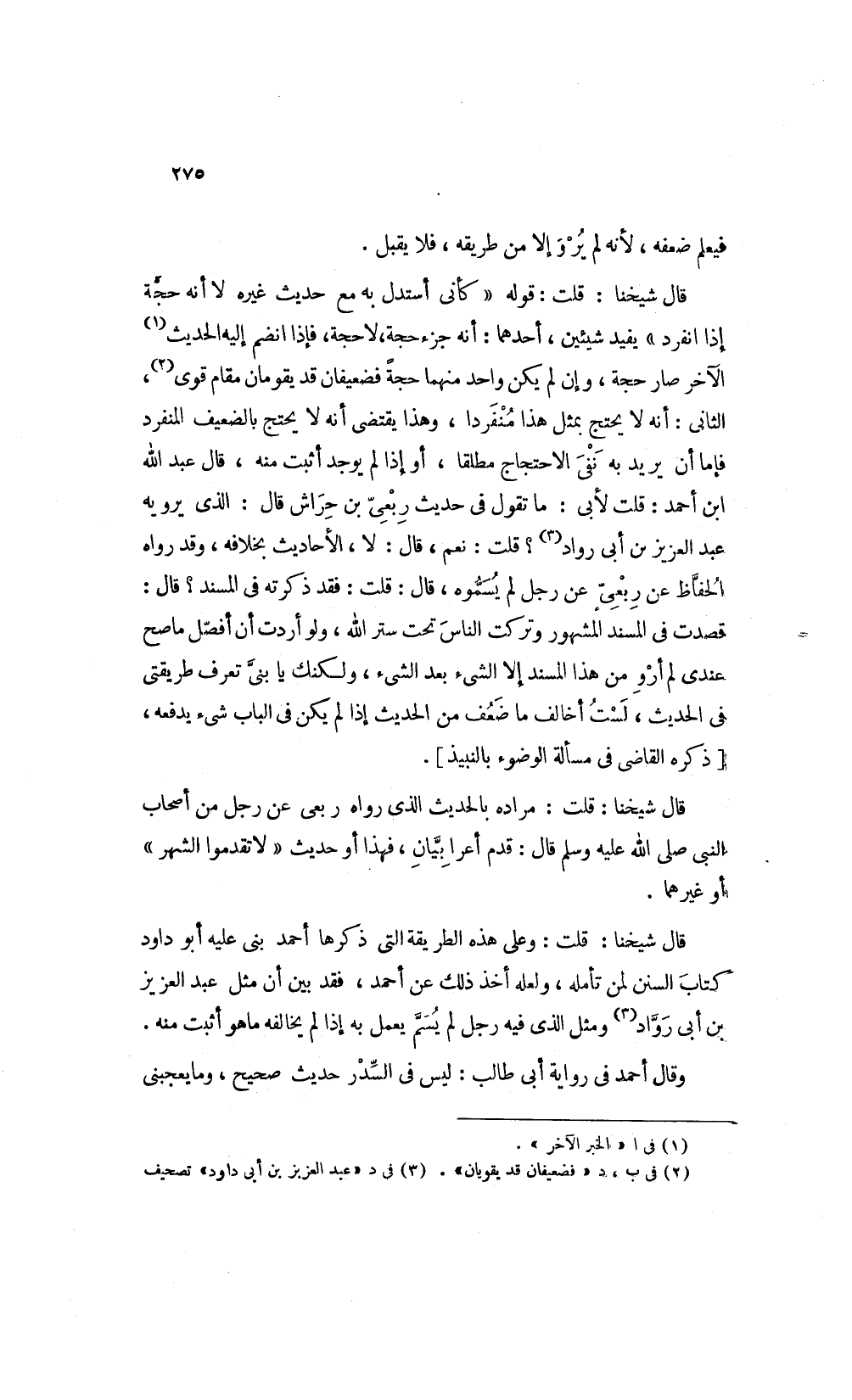 قال شيخنا قلت: وعلى هذه الطريقة التي ذكرها أحمد بنى عليه أبو داود كتاب السنن لمن تأمله ولعله أخذ ذلك عن أحمد فقد بين أن مثل عبد العزيز بن أبي راود3 ومثل الذي فيه رجل لم يسم يعمل به إذا لم يخالفه ما هو أثبت منه.