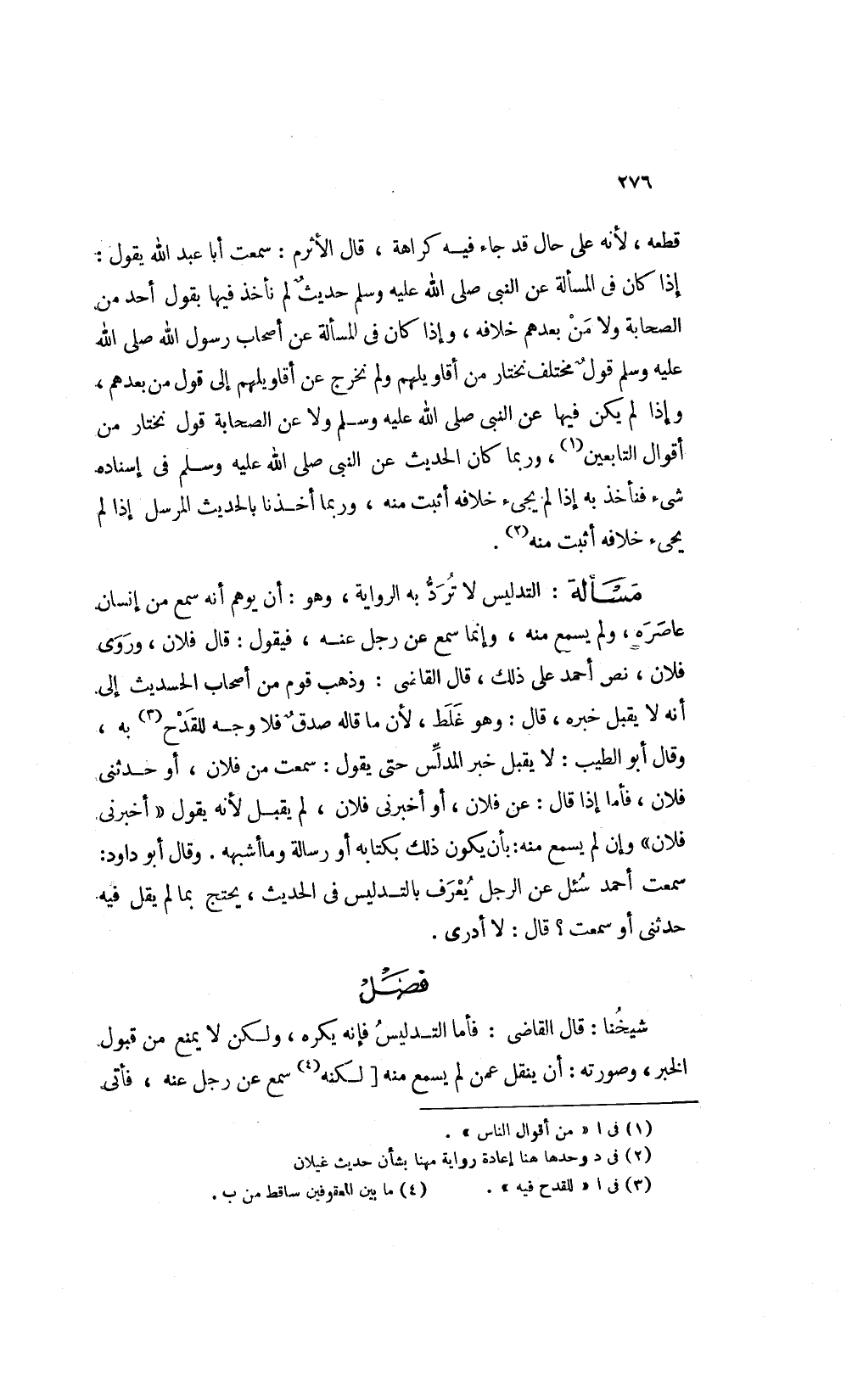 وهو أن يوهم أنه سمع من انسان عاصره ولم يسمع منه وإنما سمع عن رجل عنه فيقول قال فلان وروى فلان نص أحمد على ذلك قال القاضي وذهب قوم من أصحاب الحديث إلى أنه لا يقبل خبره قال هو غلط لأن ما قاله صدق فلا وجه للقدح1 به وقال أبو الطيب لا يقبل خبر المدلس حتى يقول سمعت من فلان أو حدثنى فلان فأما إذا قال عن فلان أو أخبرنى فلان لم يقبل لأنه يقول أخبرنى فلان وإن لم يسمع منه بأن يكون ذلك بكتابه بكتابة أو رسالة وما أشبهه وقال أبو داود سمعت أحمد سئل عن الرجل يعرف بالتدليس في الحديث يحتج بما لم يقل فيه حدثنى أو سمعت قال لا أدري.