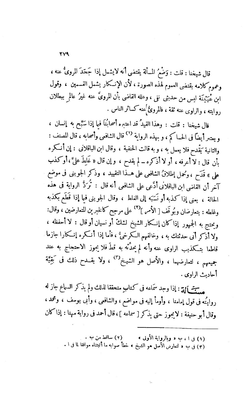قال شيخنا قلت: وهذا القيد قد اعتبره اصحابنا فيما إذا سبح به انسان ويعتبر أيضا في الحاكم وبهذه الرواية1 قال الشافعي وأصحابه قال المصنف والثانية يقدح فلا يعمل به وبه قالت الحنفية وقال ابن الباقلاني إن أنكره بأن قال لا أعرفه أو لا أذكره لم يقدح وإن قال غلط على أو كذب على قدح وحمل اطلاق الشافعي على هذا التقييد وذكر الجوينى في موضع آخر أن القاضي ابن الباقلاني ادعى على الشافعي أنه قال ترد الرواية في هذه الحالة يعنى إذا كذبه أو نسبه إلى الغلط وقال الجوينى فيما إذا قطع بكذبه وغلطه يتعارضان ويوقف [الأمر] 2 على مرجح كالخبرين المتعارضين وقال ويحتج به الجمهور إذا كان انكر الشيخ لشك أو نسيان أو قال لا أحفظه ولا أذكر أنى حدثتك به وخالفهم الكرخي فأما إذا أنكره انكارا جازما قاطعا بتكذيب الراوى عنه وأه لم يحدثه به قط فلا يجوز الاحتجاج به عند جميعهم لتعارضهما والاصل هو الشيخ3 ولا يقدح ذلك في بقية أحاديث الراوى.