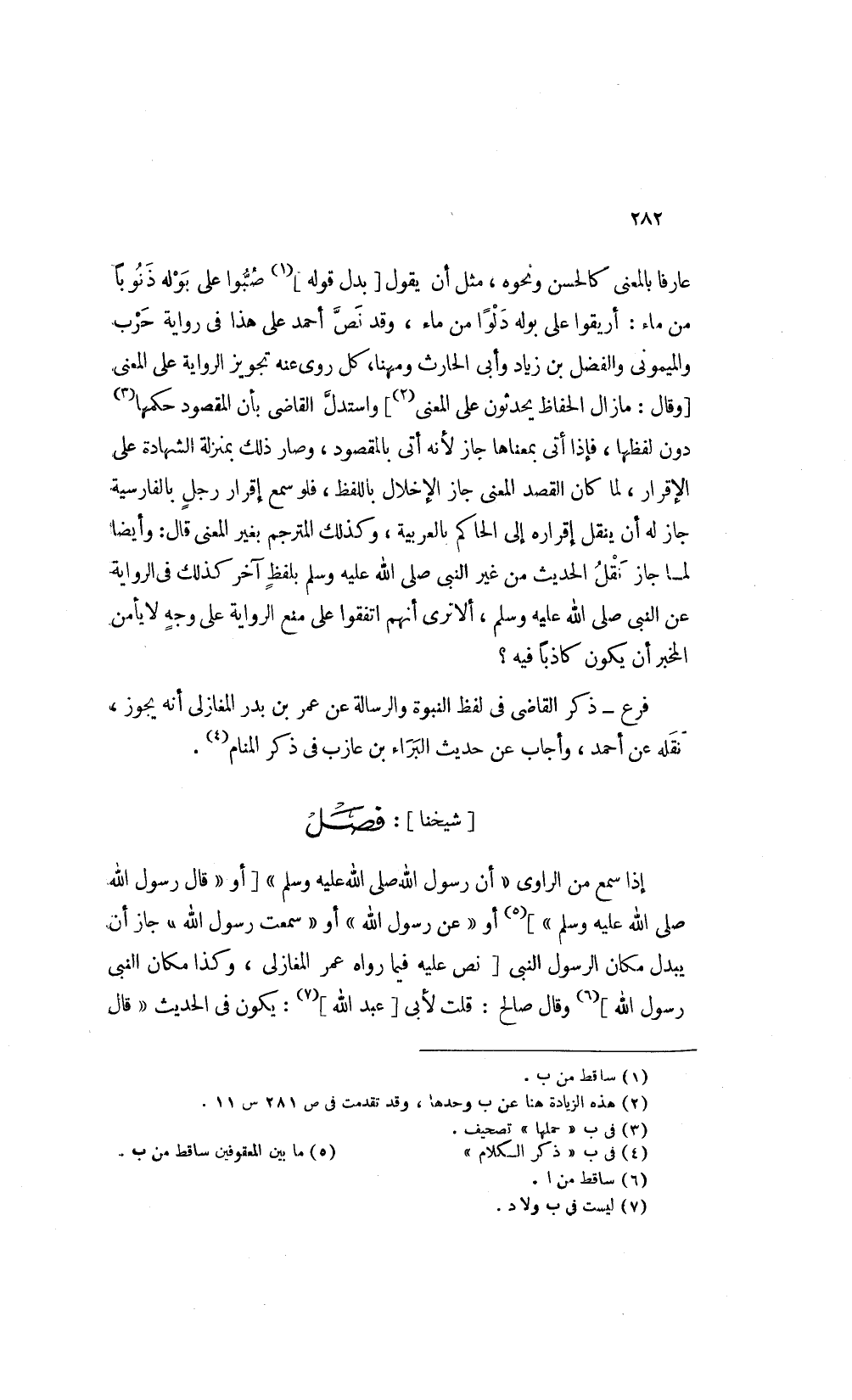 اذا سمع من الراوى أن رسول الله صلى الله عليه وسلم [أو قال رسول الله صلى الله عليه وسلم] 5 أو "عن رسول الله" أو سمعت رسول الله جاز أيبدل مكان الرسول النبي [نص عليه فيما رواه عمر المغازلي وكذا مكان النبي رسول الله] 6 وقال صالح قلت: لأبى [عبد الله] 7 يكون في الحديث قال