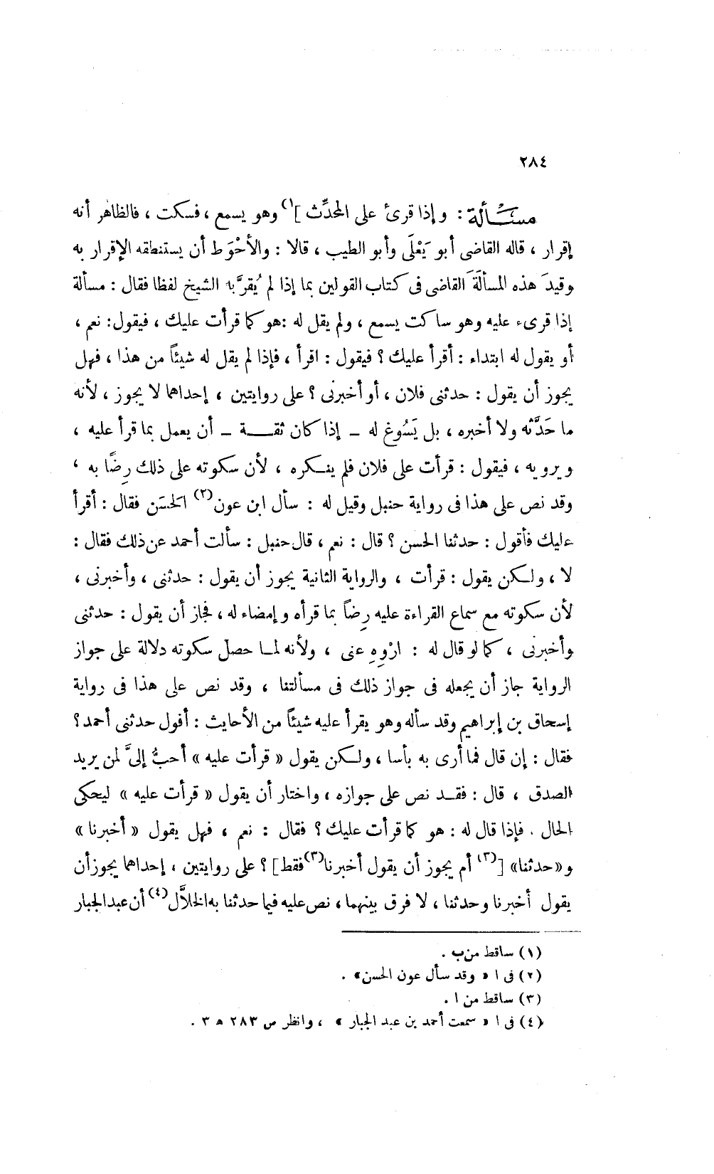 قاله القاضي أبو يعلى وأبو الطيب قالا والاحوط أن يستنطقه الاقرار به وقيد هذه المسألة القاضي في كتاب القولين بما إذا لم يقربا الشيخ لفظا فقال مسألة إذا قرىء عليه وهو ساكت يسمع ولم يقل له هو كما قرأت عليك فيقول نعم أو يقول له ابتداء أقرأ عليك فيقول اقرأ فاذا لم يقل له شيئا من هذا فهل يجوز أن يقول حدثنى فلان أو أخبرني على روايتين أحداهما لا يجوز لأنه ما حدثه ولا أخبره بل يسوغ له إذا كان ثقة أن يعمل بما قرأ عليه ويرويه فيقول قرأت على فلان فلم ينكره لأن سكوته على ذلك رضا به وقد نص على هذا في رواية حنبل وقيل له سأل ابن عون2 الحسن فقال أقرأ عليك فأقول حدثنا الحسن قال نعم قال حنبل سألت أحمد عن ذلك فقال لأن ولكن يقول قرأت والرواية الثانية يجوز أن يقول حدثنى وأخبرني لا سكوته مع سماع القراءة عليه رضا بما قرأه وامضاء له فجاز أن يقول حدثنى وأخبرنى كما لو قال له اروه عنى ولانه لما حصل سكوته دلالة على جواز الرواية جاز أن يجعله في جواز ذلك في مسألتنا وقد نص على هذا في رواية إسحاق بن إبراهيم وقد سأله وهو يقرأ عليه شيئا من الأحاديث أقول حدثنى أحمد فقال إن قال فما أرى به بأسا ولكن يقول قرأت عليه أحب إلى لمن يريد الصدق قال فقد نص على جوازه واختار أن يقول قرأت عليه ليحكى الحال فإذا قال له هو كما قرأت عليك فقال نعم فهل يقول أخبرنا وحدثنا [3أم يجوز أن يقول أخبرنا3 فقط] على روايتين إحداهما يجوز أن يقول أخبرنا ودحثنا لا فرق بينهما نص عليه فيما حدثنا به الخلال4 أن عبد الجبار