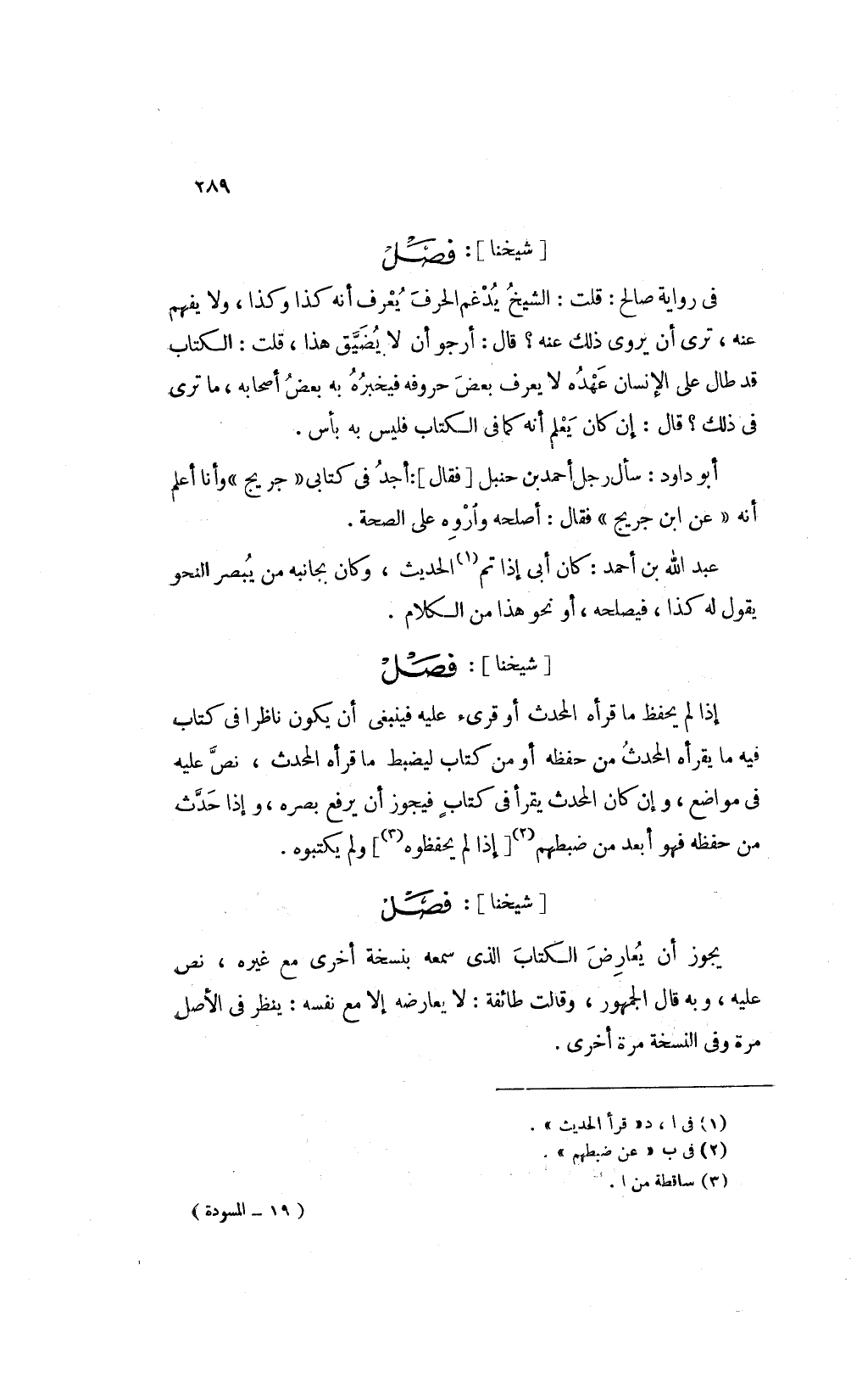 اذا لم يحفظ ما قرأه المحدث أو قرىء عليه فينبغى أن يكون ناظرا في كتاب فيه ما يقرأه المحدث من حفظه أو من كتاب ليضبط ما قرأه المحدث نص عليه في مواضع وإن كان المحدث يقرأ في كتاب فيجوز أن يرفع بصره وإذا حدث من حفظه فهو أبعد من ضبطهم2 [إذا لم يحفظوه] 3 ولم يكتبوه.