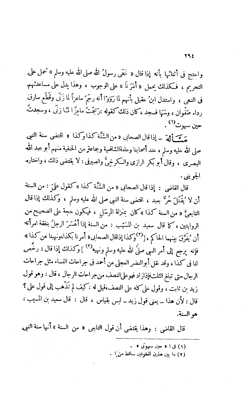 قال القاضي إذا قال الصحابي من السنة كذا كقول علي من السنة أن لايقتل حر بعبد اقتصى سنة النبي صلى الله عليه وسلم وكذلك إذا قال التابعى من السنة كذا كان منزلة المرسل فيكون حجة على الصحيح من الروايتين كما قال سعيد بن المسيب من السنة إذا أعسر الرجل بنفقة امرأته أن يفرق بينهما الحاكم [1وكذا إذا قال الصحابي أمرنا بكذا ونهينا عن كذا فإنه يرجع إلى أمر النبي صلى الله عليه وسلم ونهيه1] وكذلك إذا قال رخص لنا في كذا وقد نقل أبو النضر العجلى عن أحمد في جراحات النساء مثل جراحات الرجال حتى تبلغ الثلث فاذا زاد فهو على النصف من جراحات الرجال قال وهو قول زيد بن ثابت وقول علي كله على النصف قيل له كيف لم تذهب إلى قول علي قال لأن هذا يعنى قول زيد ليس بقياس قال قال سعيد بن المسيب هو السنة.
