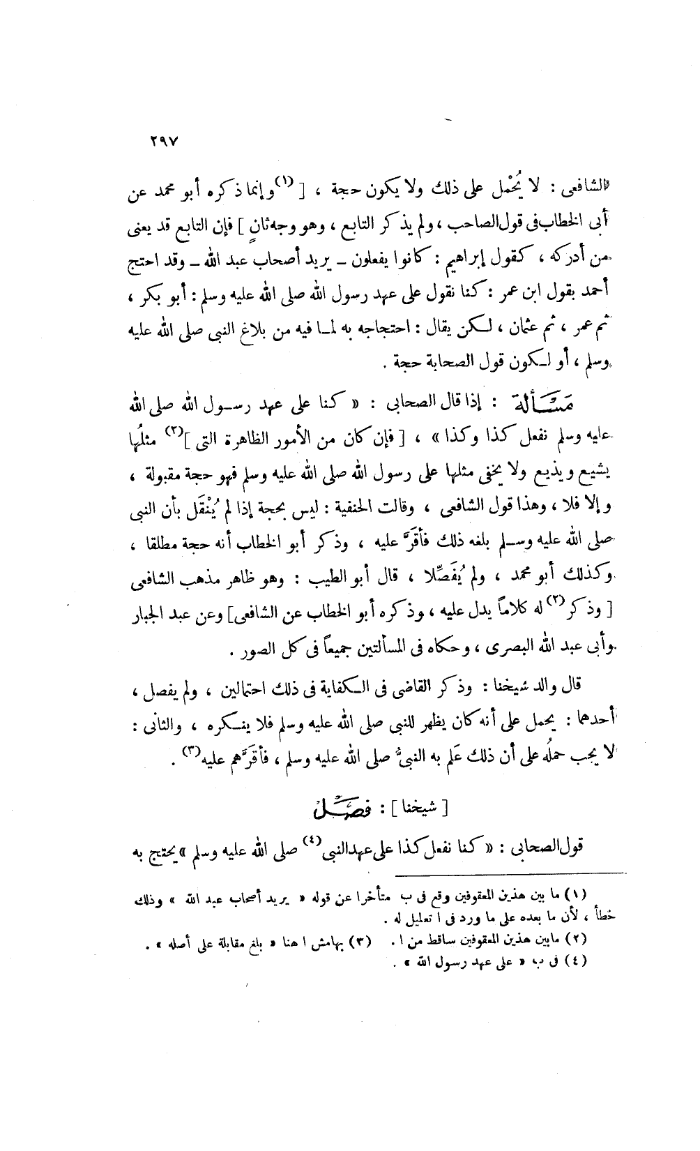 الشافعي لا يحمل على ذلك ولا يكون حجة [1وإنما ذكره أبو محمد عن أبي الخطاب في قول الصاحب ولم يذكر التابع وهو وجه ثان] فإن التابع قد يعنى من أدركه كقول إبراهيم كانوا يفعلون يريد أصحاب عبد الله وقد احتج أحمد بقول ابن عمر كنا نقول على عهد رسول الله صلى الله عليه وسلم أبو بكر ثم عمر ثم عثمان لكن يقال احتجاجه به لما فيه من بلاغ النبي صلى الله عليه وسلم أو لكون قول الصحابه حجة.