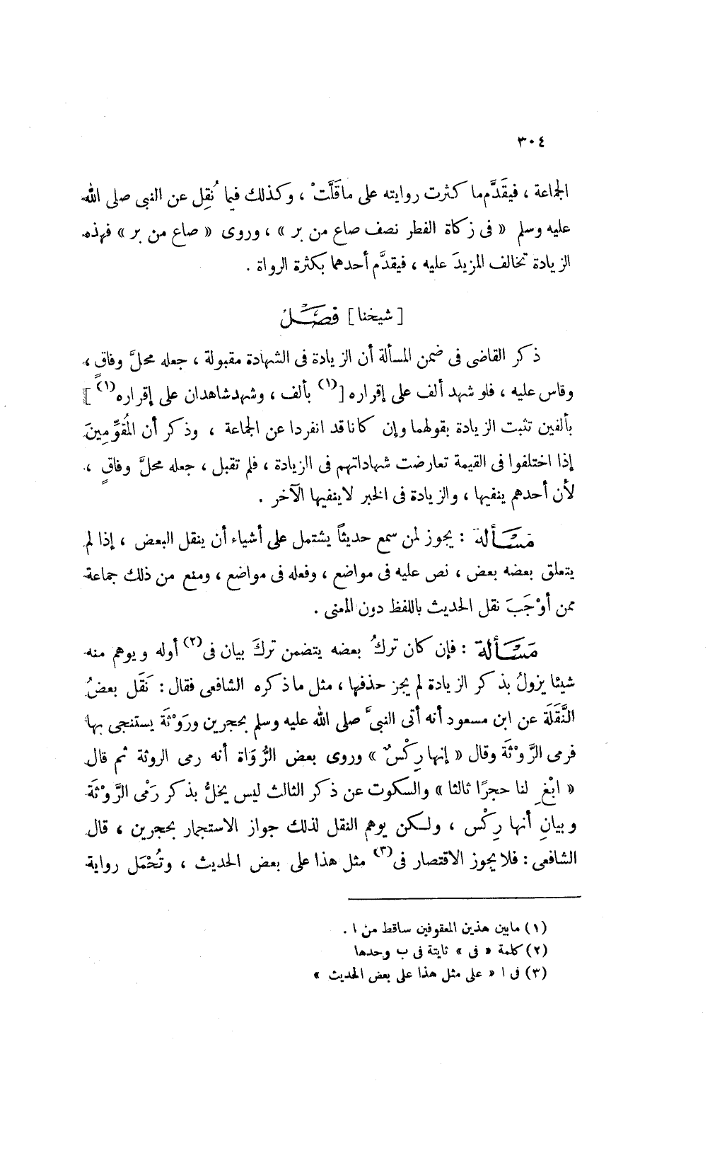 ويوهم منه شيئا يزول بذكر الزيادة لم يجز حذفها مثل ما ذكره الشافعي فقال نقل بعض النقلة عن ابن مسعود أنه أتى النبي صلى الله عليه وسلم بحجرين وروثة يستنجى بها فرمى الروثة وقال: "إنها ركس" وروى بعض الرواة انه رمى الروثة ثم قال: "ابغ لنا حجرا ثالثا" والسكوت عن ذكر الثالث ليس يخل بذكرى رمى الروثة وبيان أنها ركس ولكن يوهم النقل لذلك جواز الاستجمار بحجرين قال الشافعي فلا يجوز الاقتصار في2 مثل هذا على بعض الحديث وتحمل رواية
