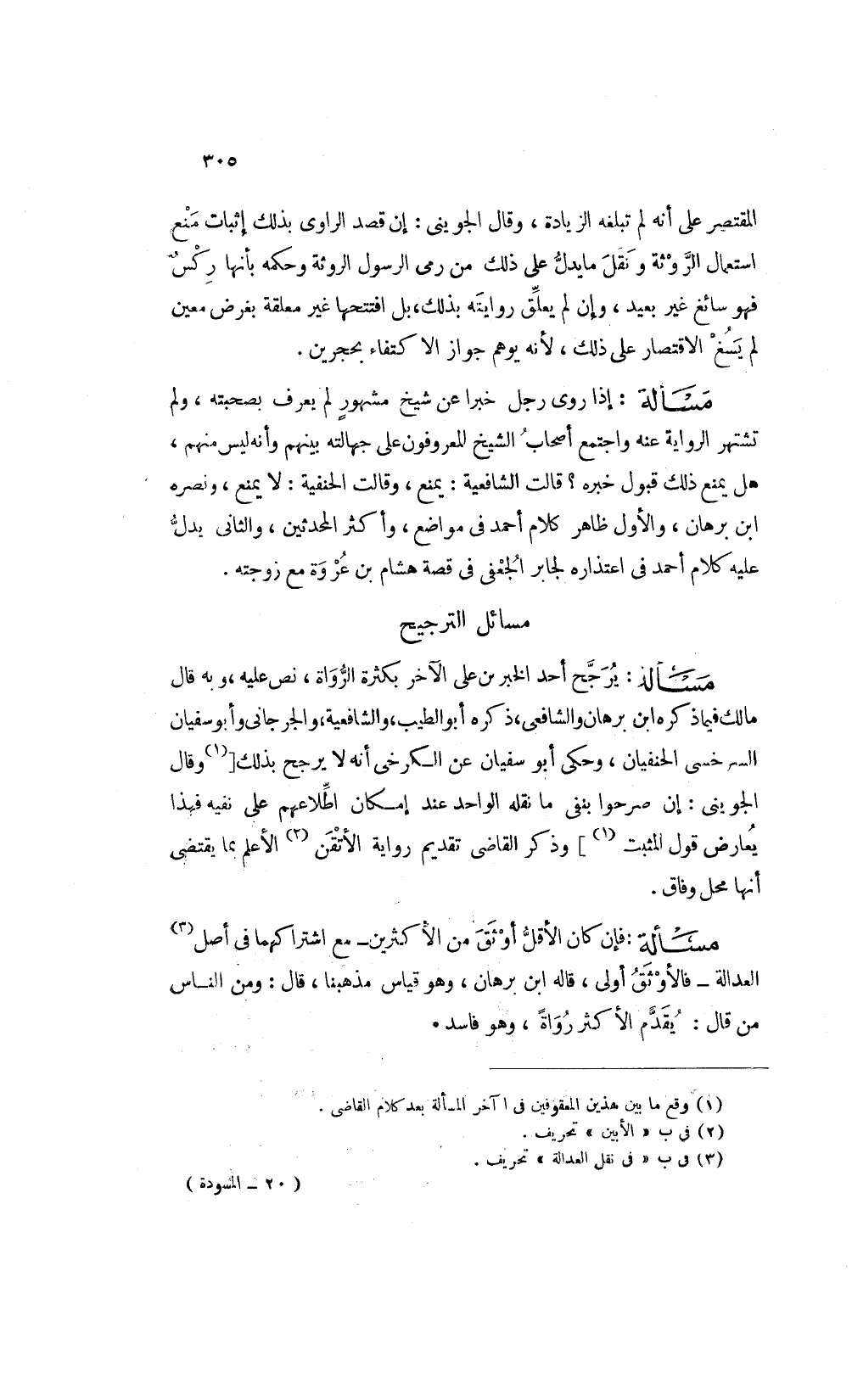 مسألة: فإن كان الاقل أوثق من الأكثرين مع اشتراكهما في أصل1 العدالة فالاوثق أولى قاله ابن برهان وهو قياس مذهبنا قال ومن الناس من قال يقدم الأكثر رواة وهو فاسد.