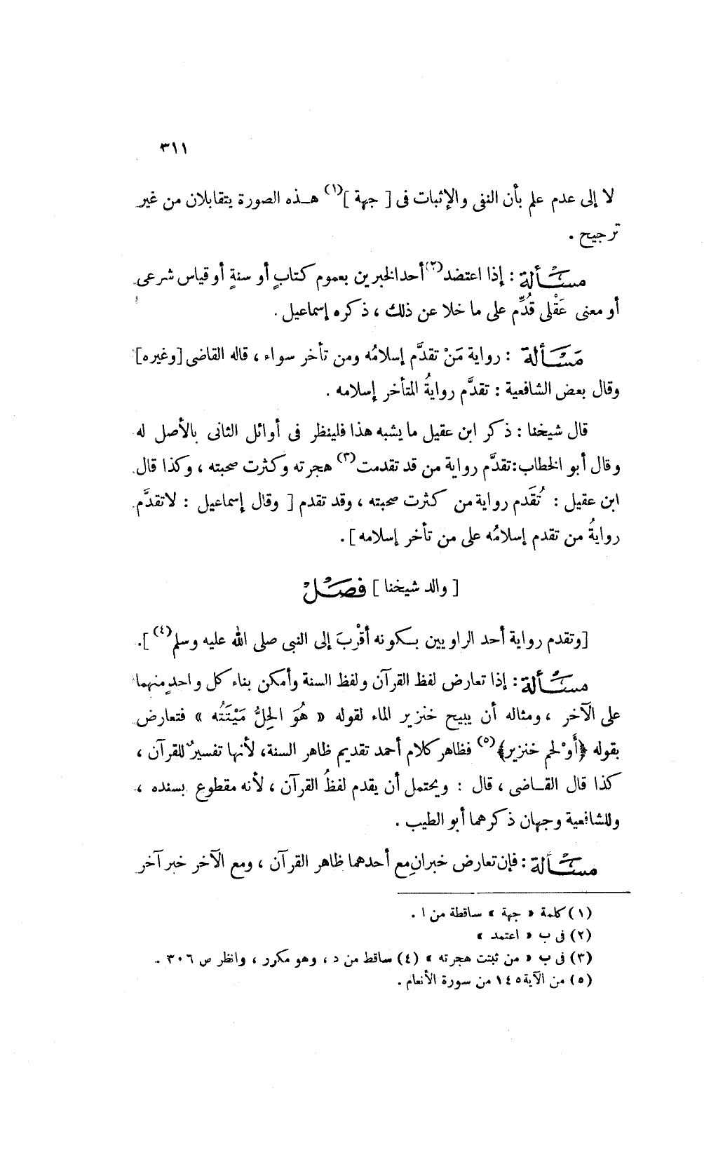 مسألة: اذاتعارض لفظ لقرآن ولفظ السنة وأمكن بناء كل واحد منهما على الآخر ومثاله أن يبيح خنزير الماء لقوله هو الحل ميتته فتعارض بقوله: {أَوْ لَحْمَ خِنْزِيرٍ} 1 فظاهر كلام أحمد تقديم ظاهر السنة لانها تفسير للقرآن كذا قال القاضي قال ويحتمل أن يقدم لفظ القرآن لأنه مقطوع بسنده وللشافعية وجهان ذكرهما أبو الطيب.