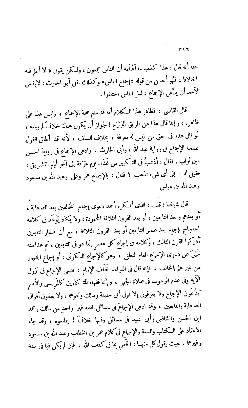قال شيخنا قلت: الذي أنكره أحمد دعوى إجماع المخالفين بعد الصحابة أو بعدهم وبعد التابعين أو بعد القرون الثلاثة المحمودة ولا يكاد يوجد في كلامه احتجاج باجماع بعد عصر التابعين أو بعد القرون الثلاثة مع أن صغار التابعين أدركوا القرن الثالث وكلامه في إجماع كل عصر إنما هو في التابعين ثم هذا منه نهى عن دعوى الإجماع العام النطقى وهو كالاجماع السكوتى أو إجماع الجمهور من غير علم بالمخالف فانه قال في القراءة خلف الإمام ادعى الإجماع في نزول الآية وفى عدم الوجوب في صلاة الجهر وإنما فقهاء المتكلمين كالمريسي والاصم يدعون الإجماع ولا يعرفون إلا قول أبي حنيفة ومالك ونحوهما ولا يعلمون أقوال الصحابة والتابعين وقد ادعى الإجماع في مسائل الفقه غير واحد من مالك ومحمد ابن الحسن والشافعى وأبي عبيد في مسائل وفيها خلاف لم يطلعوه وقد جاء الإعتماد على الكتاب والسنة والإجماع في كلام عمر بن الخطاب وعبد الل بن مسعود وغيرهما حيث يقول كل منهما اقض بما في كتاب الله فإن لم يكن فبما في سنة