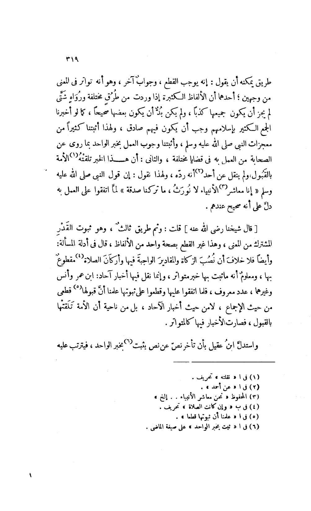 طريق يمكنه أن يقول انه يوجب القطع وجواب آخر وهو أنه تواتر في المعنى من وجهين أحدهما أن الالفاظ الكثيرة إذا وردت من طرق مختلفة ورواه شتى لم يجز أن يكون جميعها كذبا ولم يكن بد أن يكون بعضها صحيحا كما لو أخبرنا الجمع الكثير بإسلامهم وجب أن يكون فيهم صادق ولهذا أثبتنا كثيرا من معجزات النبي صلى الله عليه وسلم وأثبتنا وجوب العمل بخبر الواحد بما روى عن الصحابة من العمل به في قضايا مختلفة والثاني أن هذا الخبر تلقته1 الأمة بالقبول ولم ينقل عن أحد2 أنه رده ولهذا نقول إن قول النبي صلى الله عليه وسلم: "إنا معاشر3 الانبياء لا نورث ما تركنا صدقة" لما اتفقوا على العمل به دل على أنه صحيح عندهم.