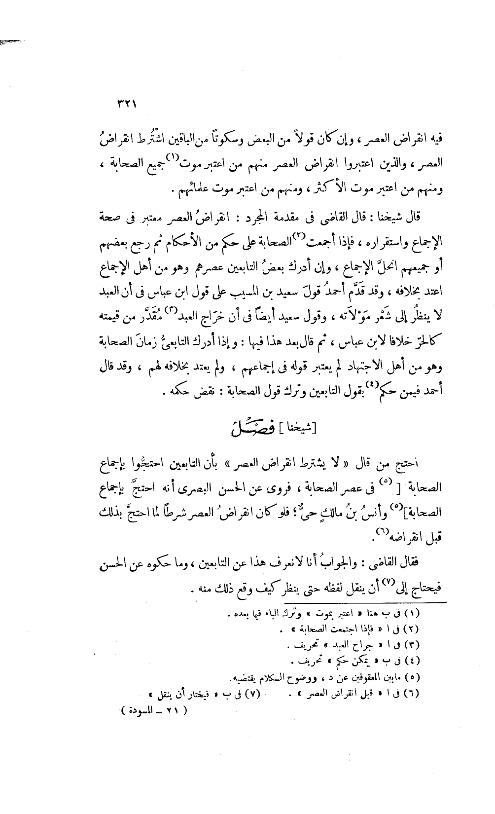 احتج من قال: "لا يشترط انقراض العصر" بأن التابعين احتجوا باجماع الصحابة [5في عصر الصحابة فروى عن الحسن البصرى أنه احتج باجماع الصحابة] 5 وأنس بن مالك حى فلو كان انقراض العصر شرطا لما احتج بذلك قبل انقراضه6.