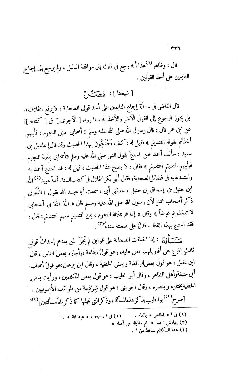 قال القاضي في مسألة إجماع التابعين على أحد قولى الصحابة لا يرفع الخلاف بل يجوز الرجوع إلى القول الآخر والآخذ به لما رواه [الآجرى] في [كتابه] عن ابن عمر قال قال رسول الله صلى الله عليه وسلم: "أصحابي مثل النجوم فأيهم أخذتم بقوله اهتديتم" فقيل له كيف تحتجون بهذا الحديث وقد قال إسمعيل بن سعيد سألت أحمد عمن احتج بقول النبي صلى الله عليه وسلم: "أصحابي بمنزلة النجوم فبأيهم اقتديتم اهتديتم" فقال لا يصح هذا الحديث قيل له قد احتج أحمد به واعتمد عليه في فضائل الصحابة فقال أبو بكر الخلال في كتاب السنة أنبأ عبيد2 الله ابن حنبل بن إسحاق بن حنبل حدثني أبي سمعت أبا عبد الله يقول الغلو في ذكر أصحاب محمد لأن رسول الله صلى الله عليه وسلم قال: "الله الله في أصحابي لا تتخذوهم غرضا" وقال: "إنما هم بمنزلة النجوم بمن اقتديتم منهم اهتديتم" قال فقد احتج بهذا اللفظ فدل على صحته عنده3.