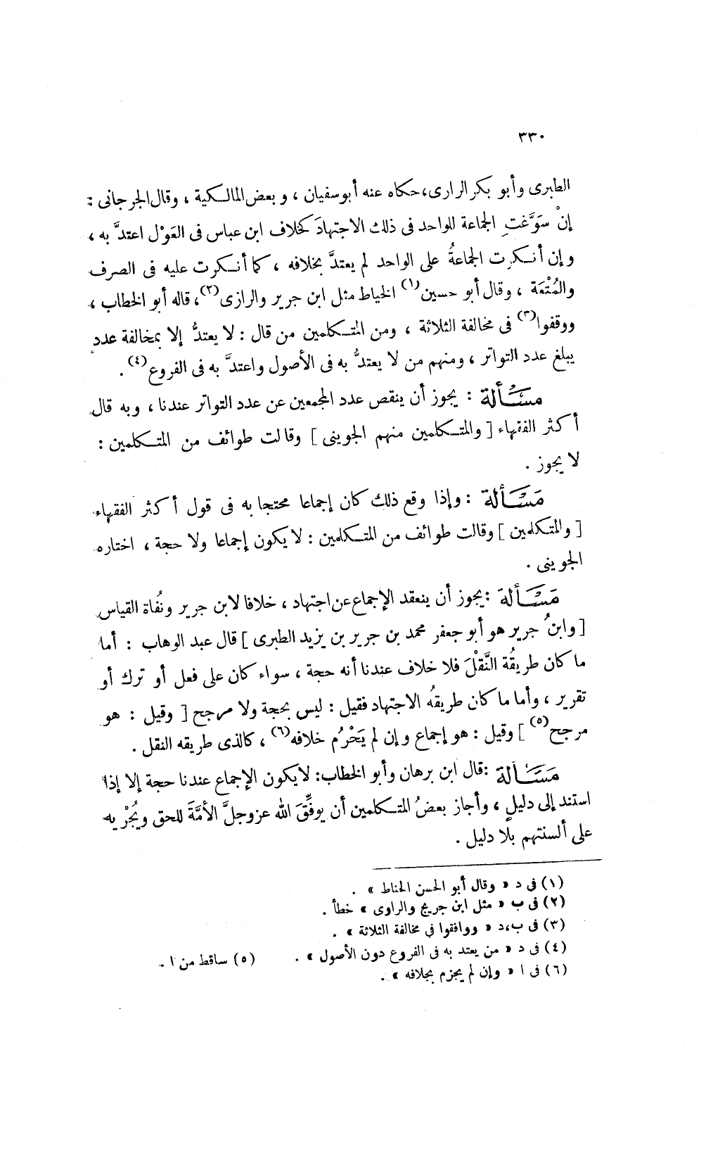 الطبري وأبو بكر الرازي حكاه عنه أبوسفيان وبعض المالكية وقال الجرجاني إن سوغت الجماعة للواحد في ذلك الاجتهاد كخلاف ابن عباس في العول اعتد به وإن انكرت الجماعة على الواحد لم يعتد بخلافه كما أنكرت عليه في الصرف والمتعة وقال أبو حسين1 الخياط مثل ابن جرير والرازي2 قاله أبو الخطاب ووقفوا3 في مخالفة الثلاثة ومن المتكلمين من قال لا يعتد إلا بمخالفة عدد يبلغ عدد التواتر ومنهم من لا يعتد به في الأصول واعتد به في الفروع4.