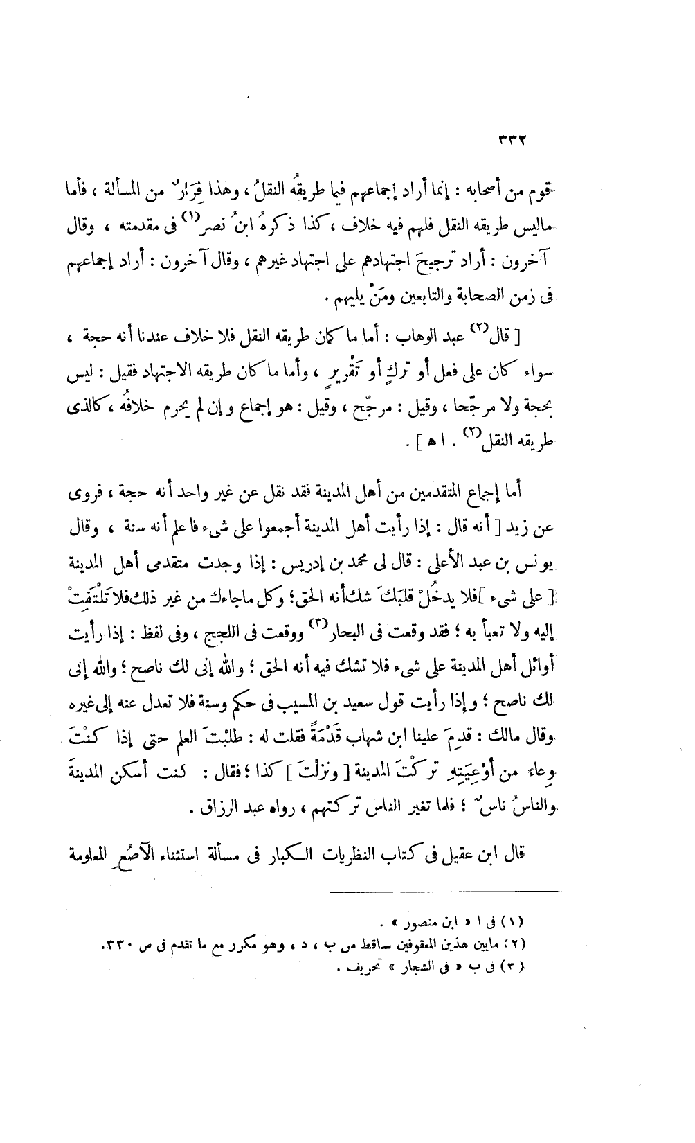 أما إجماع المتقدمين من أهل المدينة فقد نقل عن غير واحد أنه حجة فروى عن زيد أنه قال إذا رأيت أهل المدينة أجمعوا على شيء فأعلم أنه سنة وقال يونس بن عبد الأعلى قال لى محمد بن ادريس إذا وجدت متقدمي أهل المدينة [على شيء] فلا يدخل قلبك شك أنه الحق وكل ما جاءك من غير ذلك فلا تلتفت إليه ولا تعبأ به فقد وقعت في البحار3 ووقعت في اللجج وفى لفظ إذا رأيت أوائل أهل المدينة على شيء فلا تشك فيه أنه الحق والله اني لك ناصح والله اني لك ناصح وإذا رأيت قول سعيد ابن المسيب في حكم وسنة فلا تعدل عنه إلى غيره وقال مالك قدم علينا ابن شهاب قدمة فقلت له طلبت العلم حتى إذا كنت وعاء من أوعيته تركت المدينة [ونزلت] كذا فقال كنت أسكن المدينة والناس ناس فلما تغير الناس تركتهم رواه عبد الرزاق