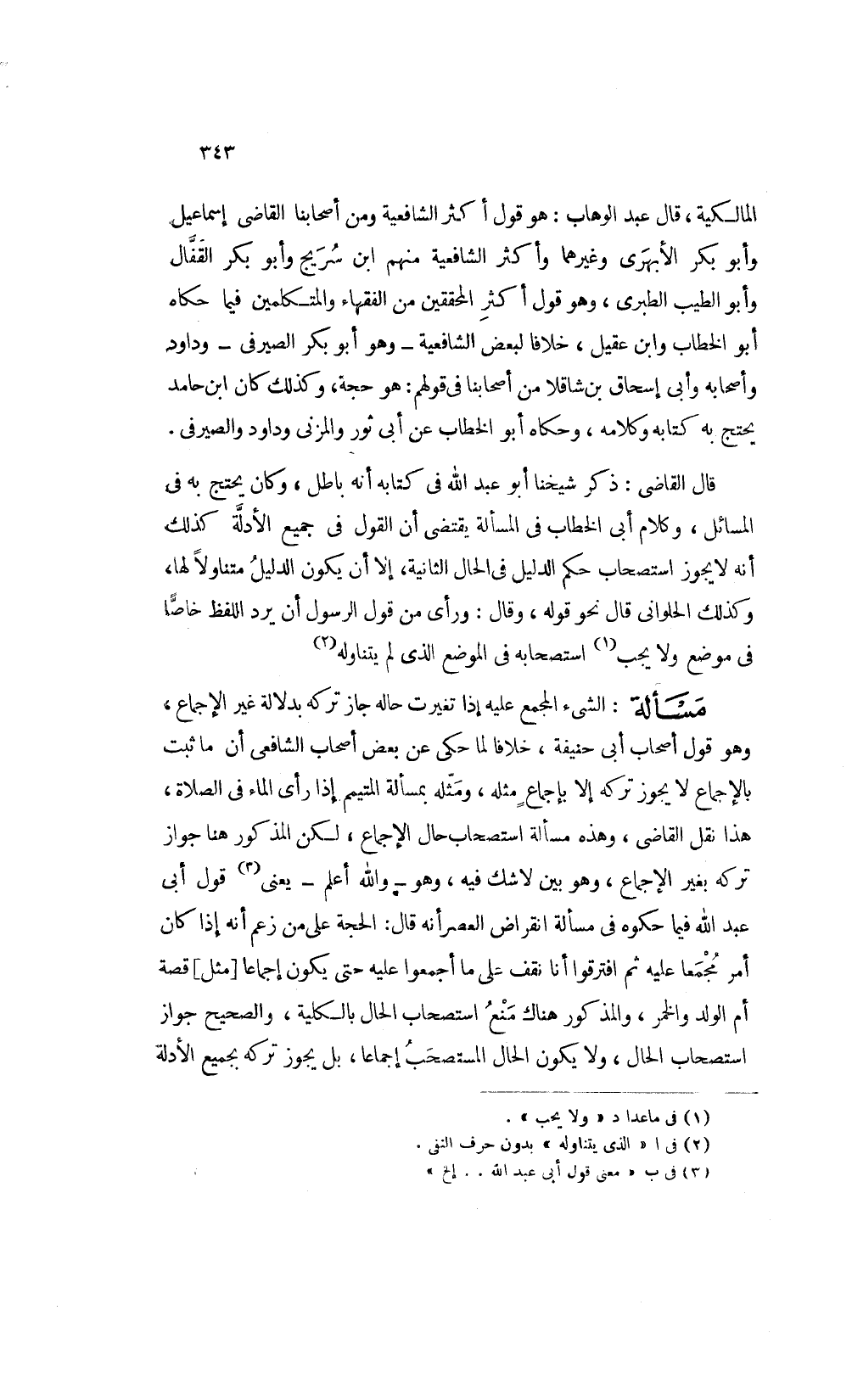 المالكية قال عبد الوهاب هو قول أكثر الشافعية ومن أصحابنا القاضي إسماعيل وأبو بكر الابهرى وغيرهما وأكثر الشافعية منهم ابن سريج وأبو بكر القفال وأبو الطيب الطبرى وهو قول أكثر المحققين من الفقهاء والمتكلمين فيما حكاه أبو الخطاب وابن عقيل خلافا لبعص الشافعية وهو أبوبكر الصيرفى وداود وأصحابه وأبى إسحاق بن شاقلا من أصحابنا في قولهم هو حجة وكذلك كان ابن حامد يحتج به كتابه وكلامه وحكاه أبو الخطاب عن أبي ثور والمزني وداود والصيرفي.