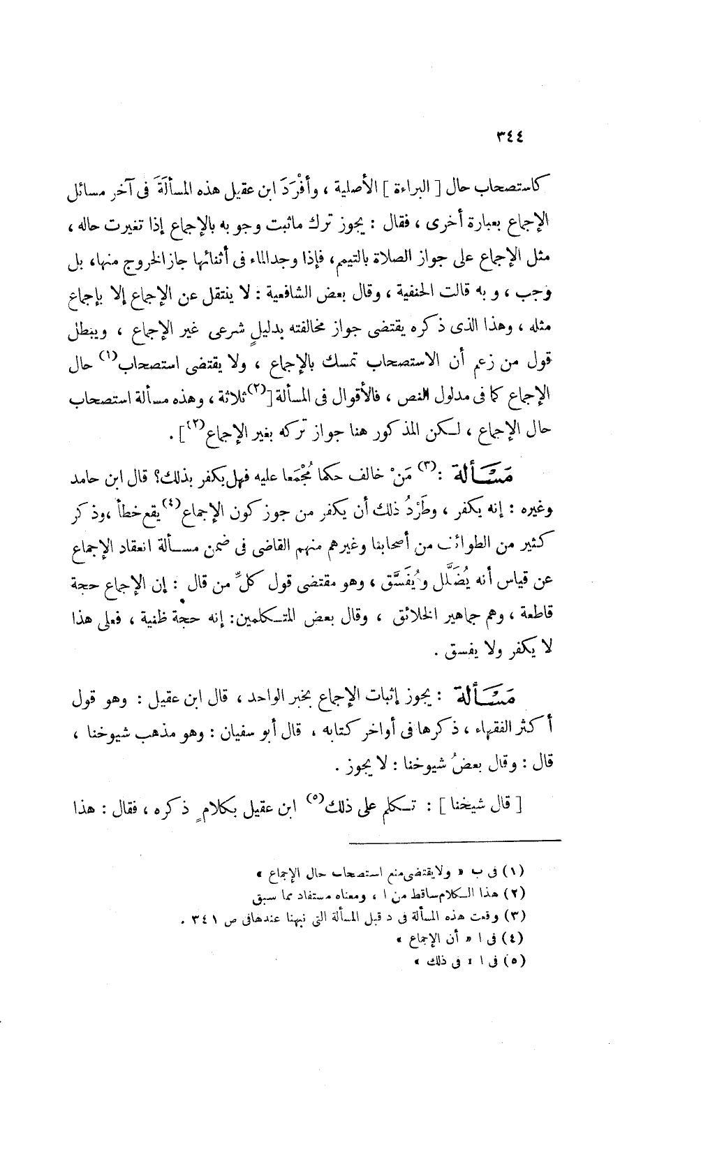 كاستصحاب حال [البراءة] الأصلية وأفرد ابن عقيل هذه المسألة في آخر مسائل الإجماع بعبارة أخرى فقال يجوز ترك ما ثبت وجوبه بالإجماع إذا تغيرت حاله مثل الإجماع على جواز الصلاة بالتيمم فإذا وجد الماء في أثنائها جاز الخروج منها بل وجب وبه قالت الحنفية وقال بعض الشافعية لا ينتقل عن الإجماع إلا باجماع مثله وهذا الذي ذكره يقتضي جواز مخالفته بدليل شرعى غير الإجماع ويبطل قول من زعم أن الاستصحاب تمسك بالاجماع ولا يقتضى استصحاب حال الإجماع كما في مدلول النص فالأقوال في المسألة [ثلاثة وهذا مسألة استصحاب1 حال الإجماع لكن المذكور هنا جواز تركه بغير الإجماع2] .