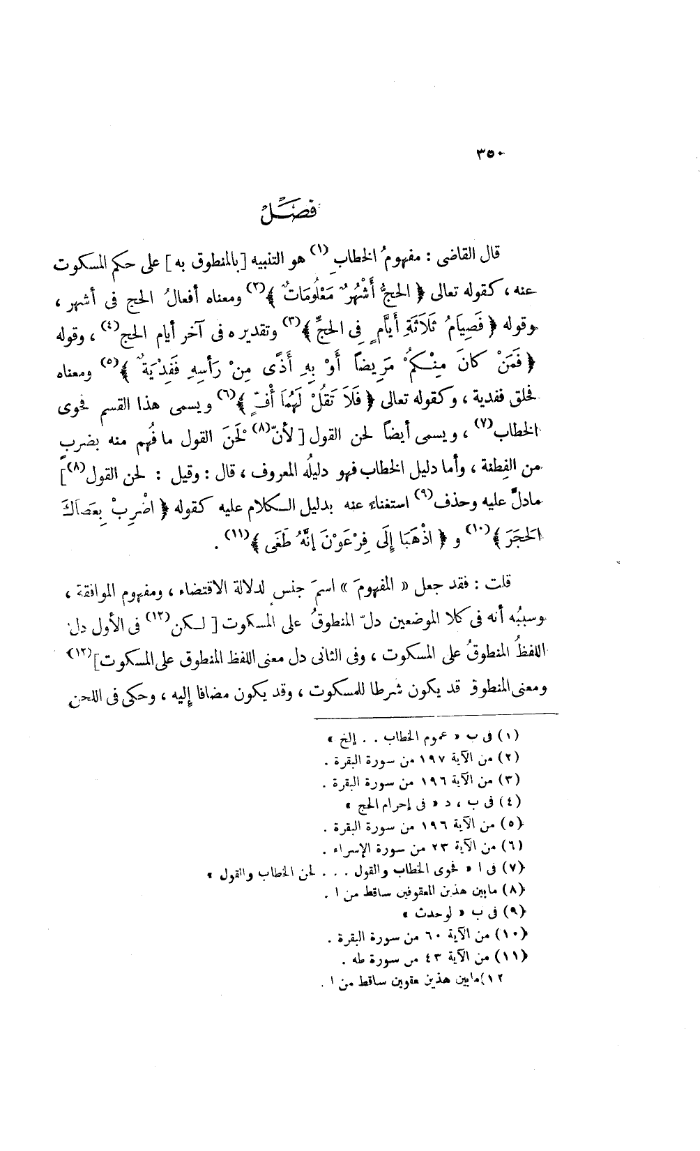 قال القاضي مفهوم الخطاب1 هو التنبيه [بالمنطوق به] على حكم المسكوت عنه كقوله تعالى: {الْحَجُّ أَشْهُرٌ مَعْلُومَاتٌ} 2 ومعناه أفعال الحج في أشهر وقوله: {فَصِيَامُ ثَلاثَةِ أَيَّامٍ فِي الْحَجِّ} 3 وتقديره في آخر أيام الحج4 وقوله: {فَمَنْ كَانَ مِنْكُمْ مَرِيضاً أَوْ بِهِ أَذىً مِنْ رَأْسِهِ فَفِدْيَةٌ} 5 ومعناه فحلق ففدية وكقوله تعالى: {فَلا تَقُلْ لَهُمَا أُفٍّ} 6 ويسمى هذا القسم فحوى الخطاب7 ويسمى أيضا لحن القول [لأن8 لحن القول ما فهم منه بضرب من الفطنة وأما دليل الخطاب فهو دليله المعروف قال وقيل لحن القول8] ما دل عليه وحذف9 استغناء عنه بدليل الكلام عليه كقوله: {اضْرِبْ بِعَصَاكَ الْحَجَرَ} 10 و {اذْهَبَا إِلَى فِرْعَوْنَ إِنَّهُ طَغَى} 11.