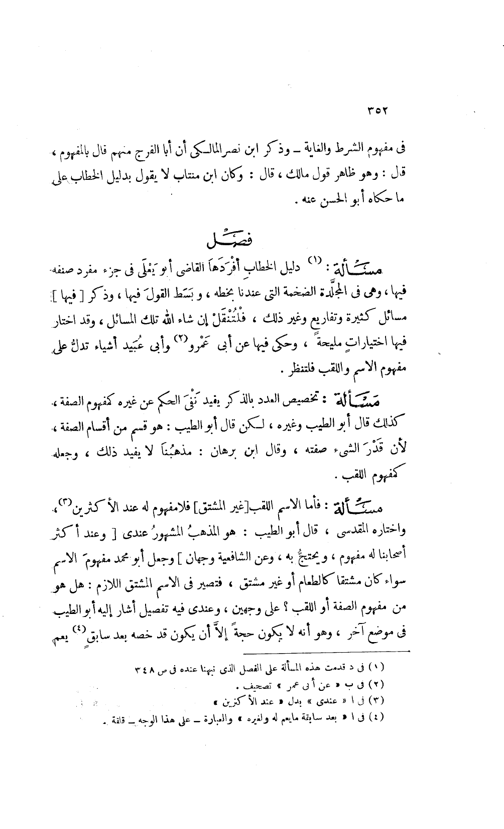 أفردها القاضي أبو يعلى في جزء مفرد صنفه فيها وهى في المجلدة الضخمة التي عندنا بخطه وبسط القول فيها وذكر [فيها] مسائل كثيرة وتفاريع وغير ذلك فلتنقل إن شاء الله تلك المسائل وقد اختار فيها اختيارات مليحة وحكى فيها عن أبي عمرو2 وأبي عبيد أشياء تدل على مفهوم الاسم واللقب فلتنظر.