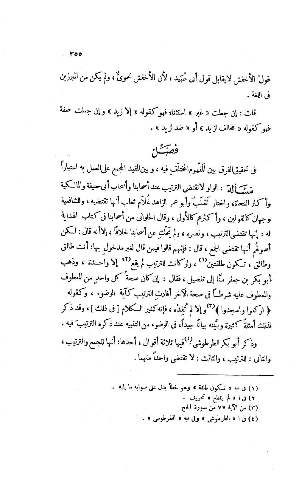 عند أصحابنا وأصحاب أبي حنيفة والمالكية وأكثر النحاة واختار ثعلب وأبوعمر الزاهد غلام ثعلب انها تقتضيه وللشافعية وجهان كالقولين وأكثرهم كالأول وقال الحلوانى من أصحابنا في كتاب الهداية له انها تقتضي الترتيب ونصره ولم يحك عن أصحابنا خلافا إلا أنه قال لكن أصولهم أنها تقتضي الجمع قال فانهم قالوا فيمن قال لغير مدخول بها أنت طالق وطالق تكون طلقتين1 ولو كانت للترتيب لم يقع2 إلا واحدة وذهب أبوبكر بن جعفر منا إلى تفصيل فقال إن كان صحة كل واحد من المعطوف والمعطوف عليه شرطا في صحة الآخر أفادت الترتيب كآية الوضوء وكقوله: {ارْكَعُوا وَاسْجُدُوا} 3 وإلا لم تفده فانه كثير الكلام في ذلك وقد ذكر لذلك أمثلة كثيرة وبينه بيانا جيدا في الوضوء من التنبيه عند ذكره الترتيب فيه.
