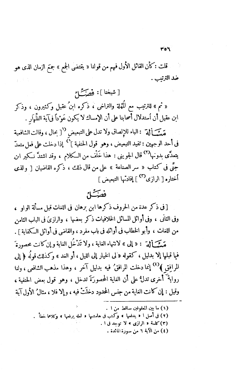 [فى ذكر عدة من الحروف ذكرها ابن برهان في اللغات قبل مسألة الواو وفى الثاني وفى أوائل المسائل الخلافيات ذكر بعضها والرازي في الباب الثامن من اللغات وأبو الخطاب في أوائله في باب مفرد والقاضي في أوائل الكفاية] .