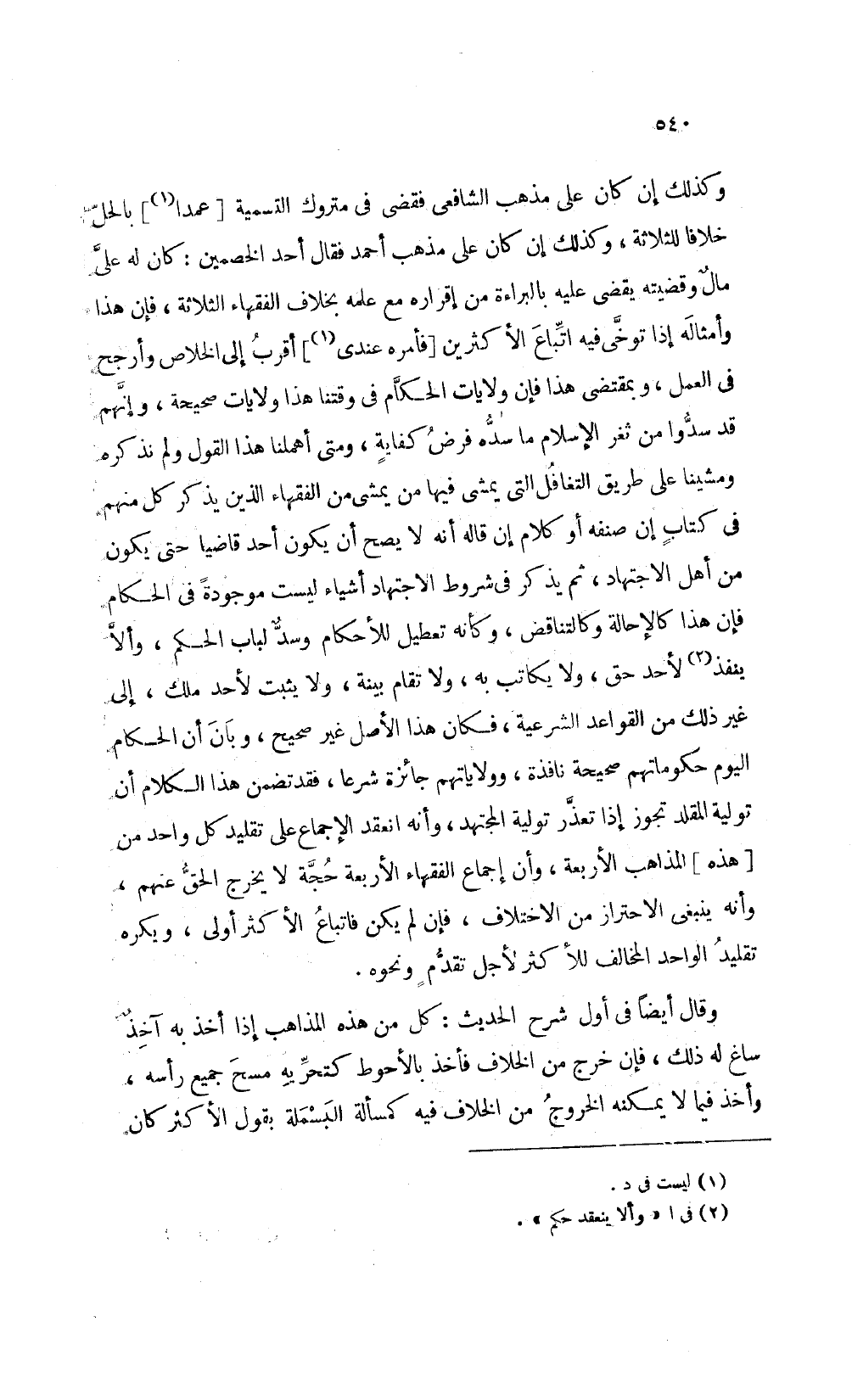 وكذلك إن كان على مذهب الشافعي فقضى في متروك التسمية [عمدا1] بالحل خلافا للثلاثة وكذلك إن كان على مذهب أحمد فقال أحد الخصمين كان له على مال وقضيته يقضى عليه بالبراءة من إقراره مع علمه بخلاف الفقهاء الثلاثة فإن هذا وأمثاله إذا توخي فيه اتباع الأكثرين [فأمره عندي2] أقرب إلى الخلاص وأرجح في العمل وبمقتضى هذا فإن ولايات الحكام في وقتنا هذا ولايات صحيحة وإنهم قد سدوا من ثغر الإسلام ما سده فرض كفاية ومتى أهملنا هذا القول ولم نذكره ومشينا على طريق التغافل التي يمشى فيها من يمشى من الفقهاء الذين يذكر كل منهم في كتاب ان صنفه أو كلام ان قاله أنه لا يصح أن يكون أحد قاضيا حتى يكون من أهل الاجتهاد ثم يذكر في شروط الاجتهاد أشياء ليست موجودة في الحكام فإن هذا كالإحالة وكالتناقض وكأنه تعطيل للأحكام وسد لباب الحكم وإلا ينفذ لأحد حق ولا يكاتب به ولا تقام بينة ولا يثبت لأحد ملك إلى غير ذلك من القواعد الشرعية فكان هذا الأصل غير صحيح وبان أن الحكام اليوم حكوماتهم صحيحة نافذة وولاياتهم جائزة شرعا فقد تضمن هذا الكلام أن تولية المقلد تجوز إذا تعذر تولية المجتهد وأنه انعقد الإجماع على تقليد كل واحد من هذه المذاهب الأربعة وإن إجماع الفقهاء حجة لا يخرج الحق عنهم وأنه ينبغي الاحتراز من الاختلاف فإن لم يكن فإتباع الأكثر أولى ويكره تقليد الواحد المخالف للأكثر لأجل تقدم ونحوه.