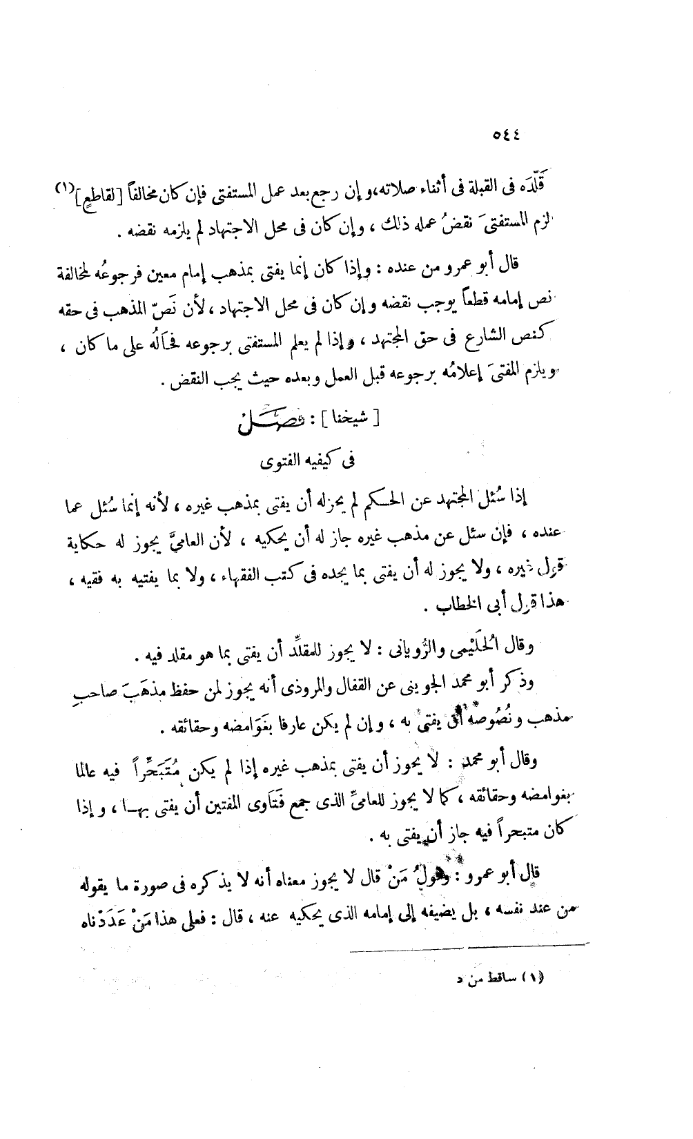 قلده في القبلة في أثناء صلاته وإن رجع بعد عمل المستفتى فإن كان مخالفا [لقاطع] 1 لزم المستفتى نقض عمله ذلك وإن كان في محل الاجتهاد لم يلزمه نقضه.
