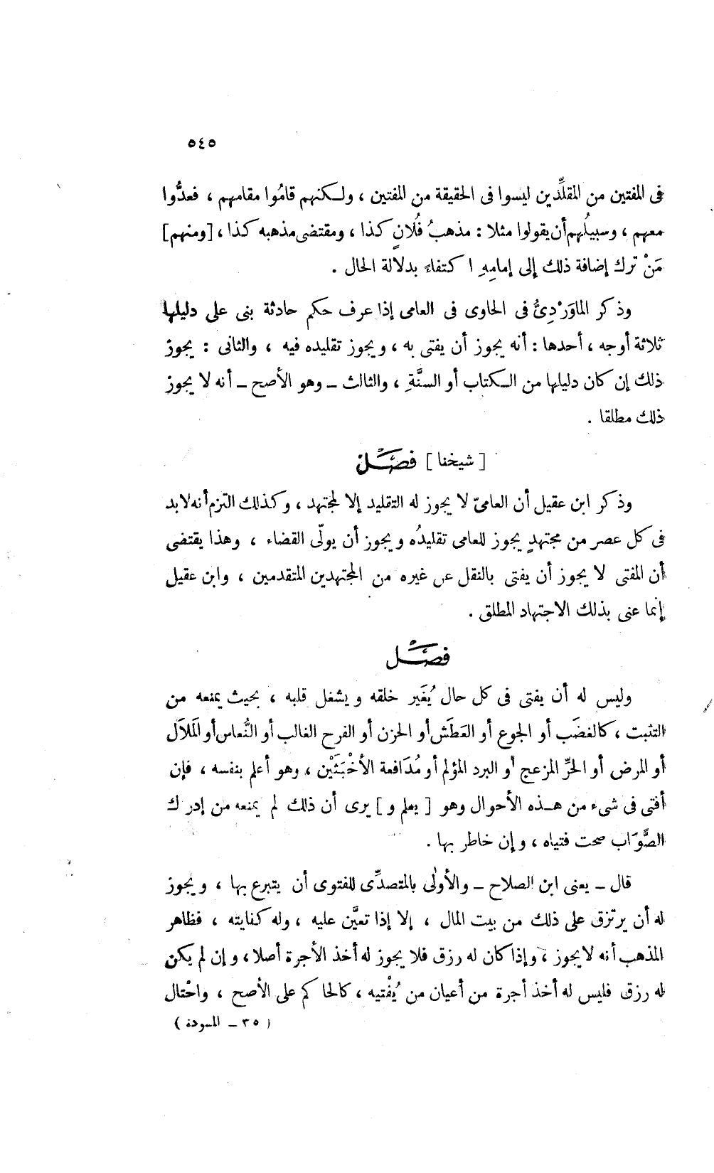 وذكر ابن عقيل أن العامي لا يجوز له التقليد إلا المجتهد وكذلك التزم أنه لا بد في كل عصر من مجتهد يجوز للعامي تقليده ويجوز أن يولى القضاء وهذا يقتضى أن المفتى لا يجوز أن يفتى بالنقل عن غيره من المجتهدين المتقدمين وابن عقيل إنما عنى بذلك الاجتهاد المطلق.