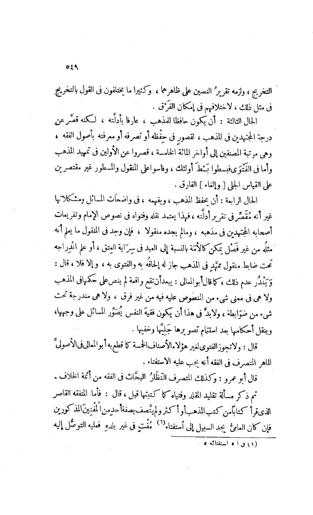 الحال الثالثة أن يكون حافظا للمذهب عارفا بأدلته لكنه قصر عن درجة المجتهدين في المذهب لقصور في حفظه أو تصرفه أو معرفته بأصول الفقه وهى مرتبة المصنفين إلى أواخر المائة الخامسة قصروا عن الأولين في تمهيد المذهب وأما في الفتوى فبسطوا بسط أولئك وقاسوا على المنقول والمسطور غير مقتصرين على القياس الجلي وإلغاء الفارق.