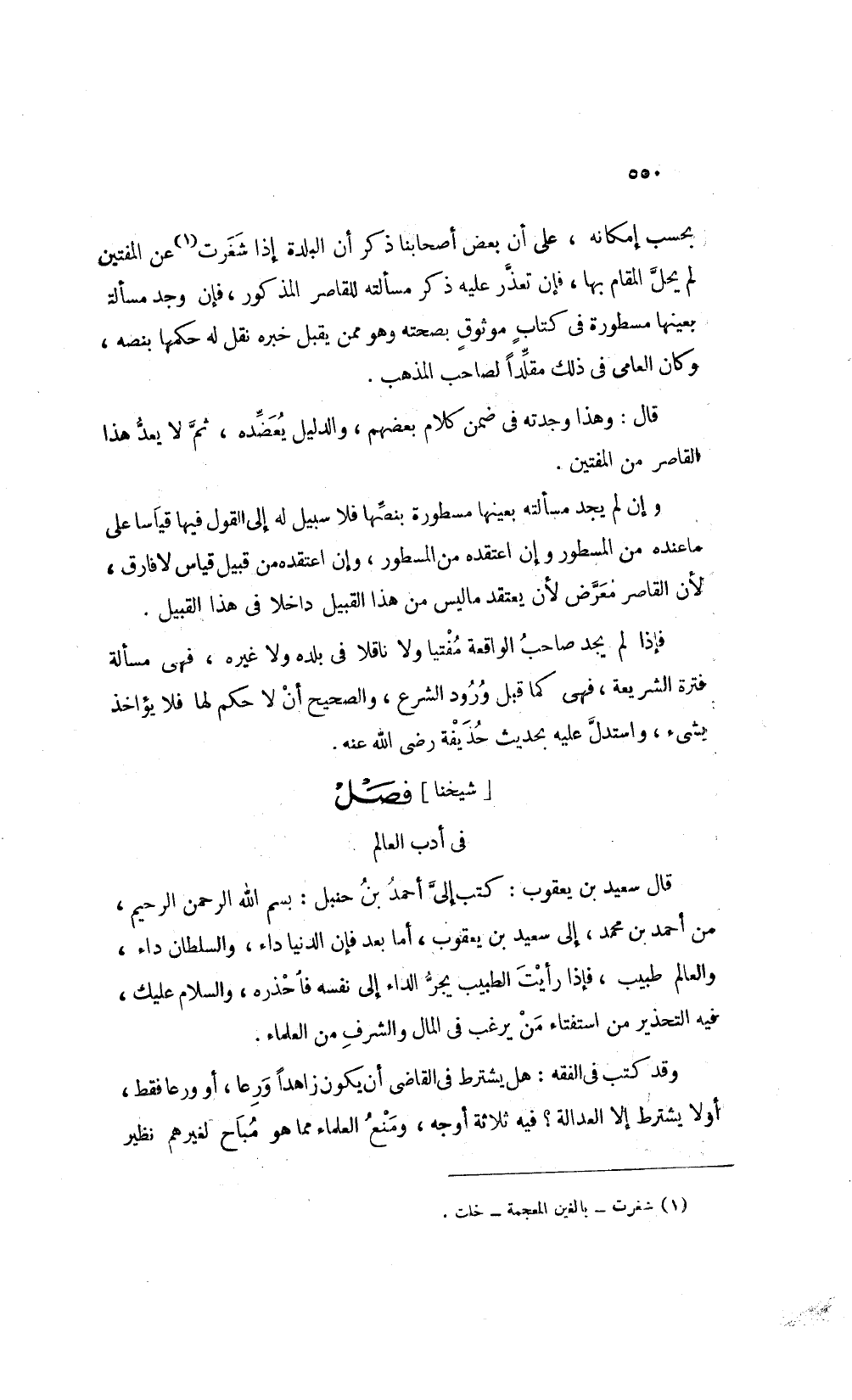 قال سعيد بن يعقوب كتب إلى أحمد بن حنبل بسم الله الرحمن الرحيم من أحمد بن محمد إلى سعيد بن يعقوب أما بعد فإن الدنيا داء والسلطان داء والعالم طبيب فإن رأيت الطبيب يجر الداء إلى نفسه فأحذره والسلام عليك فيه التحذير من استفتاء من يرغب في المال والشرف من العلماء.